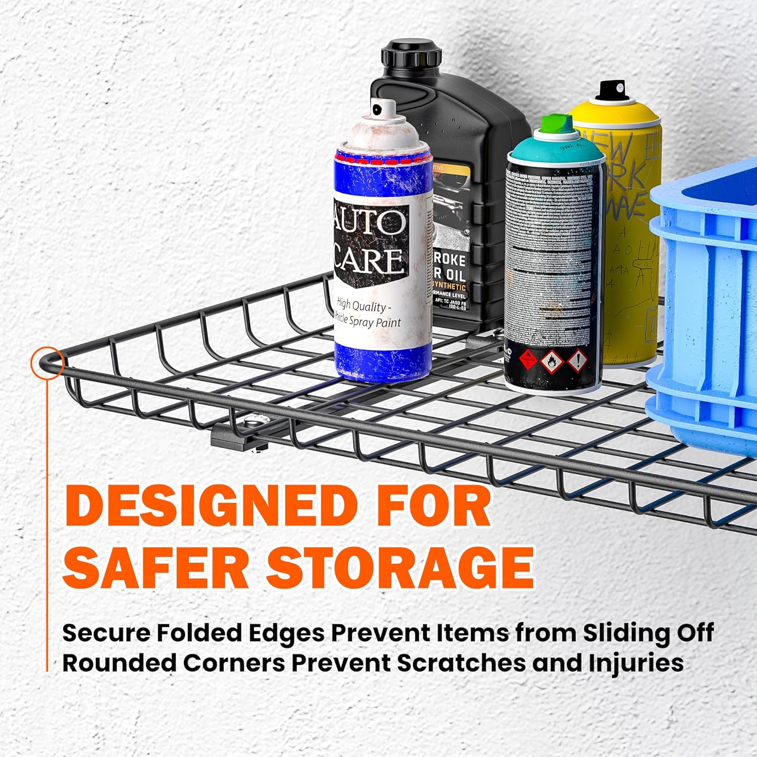 - Safe and Stable Structure: The garage wall shelving features an integrated grid and two heavy-duty L-shaped brackets for added stability. Folded edges and rounded corners prevent slipping and protect against scratches, ensuring safety in everyday use