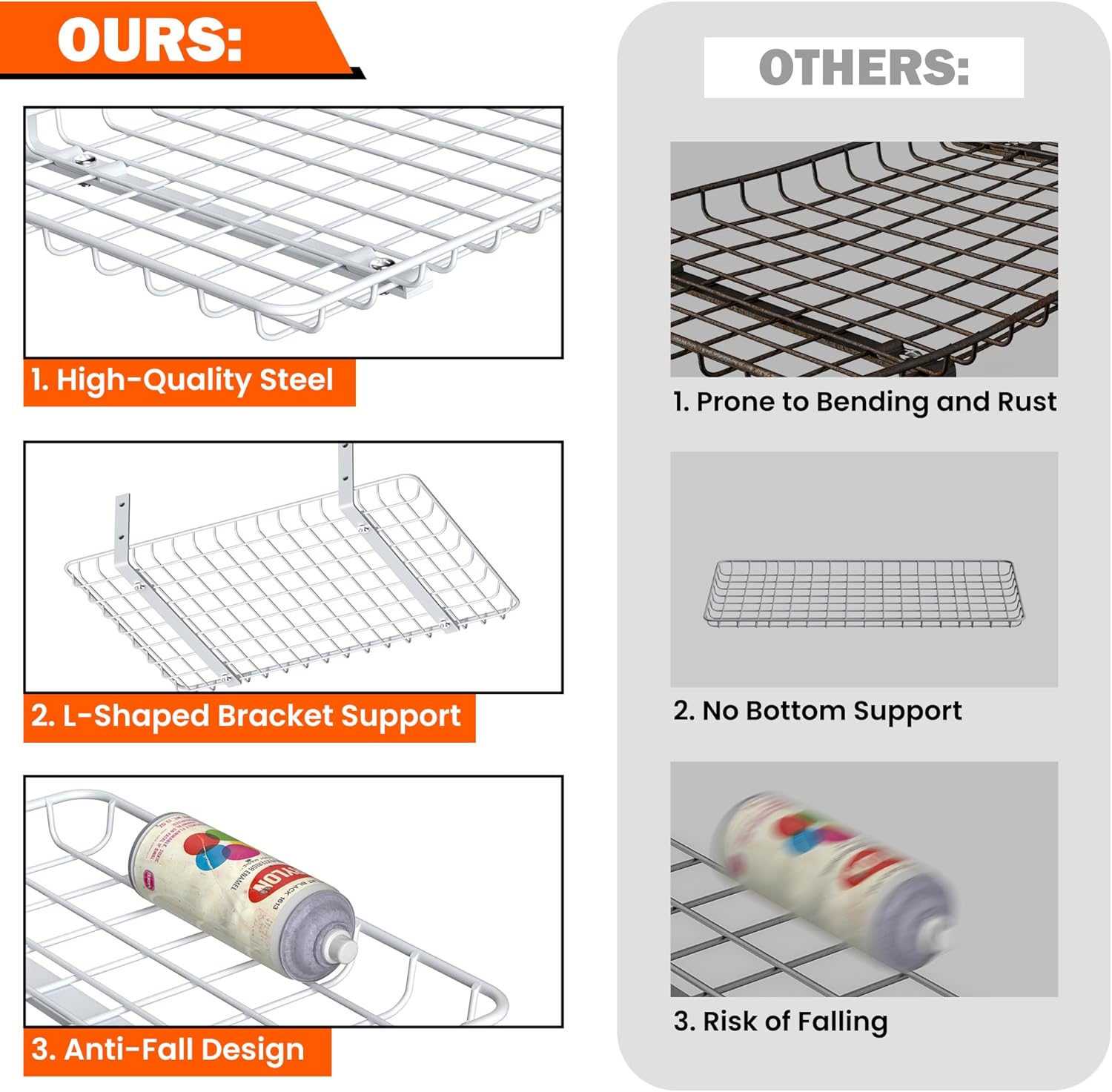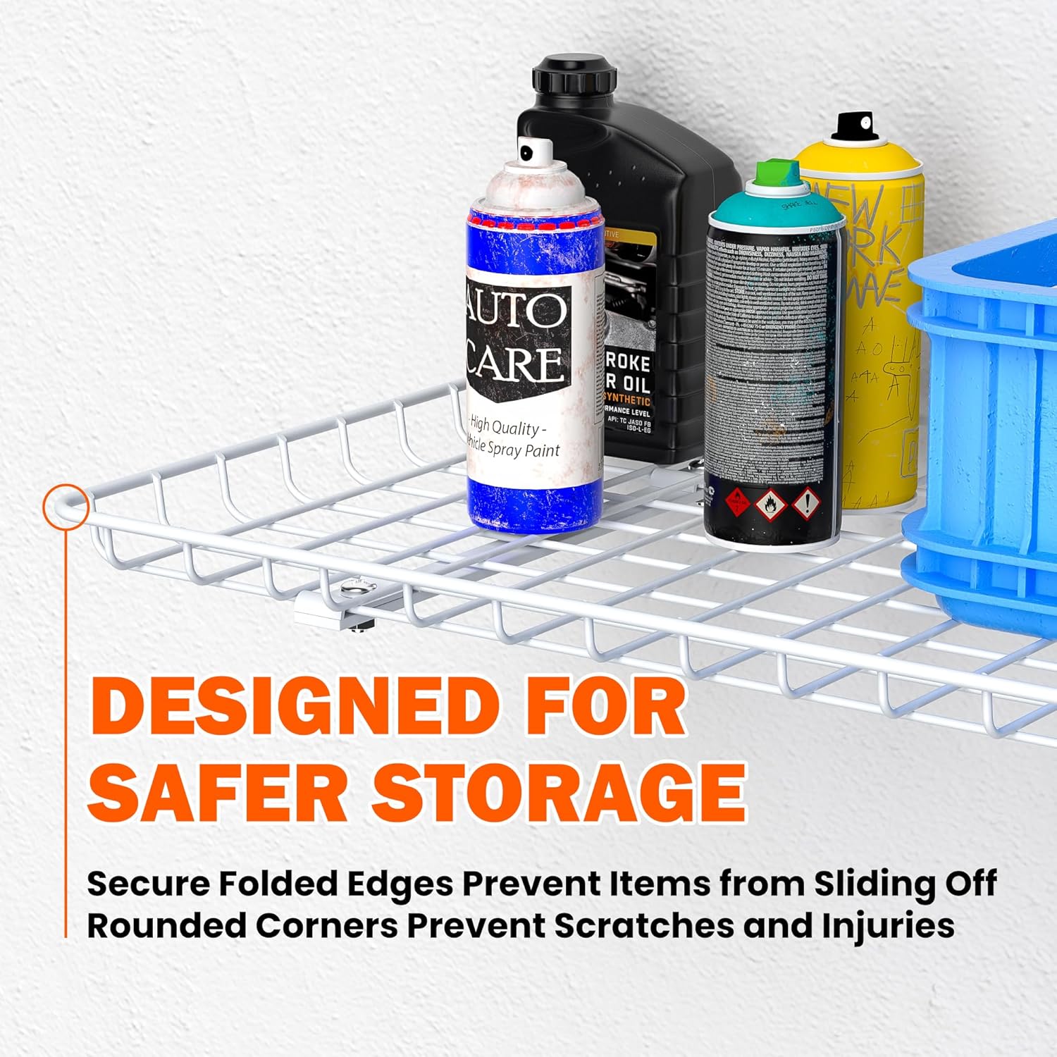 - Safe and Stable Structure: The garage wall shelving features an integrated grid and two heavy-duty L-shaped brackets for added stability. Folded edges and rounded corners prevent slipping and protect against scratches, ensuring safety in everyday use
