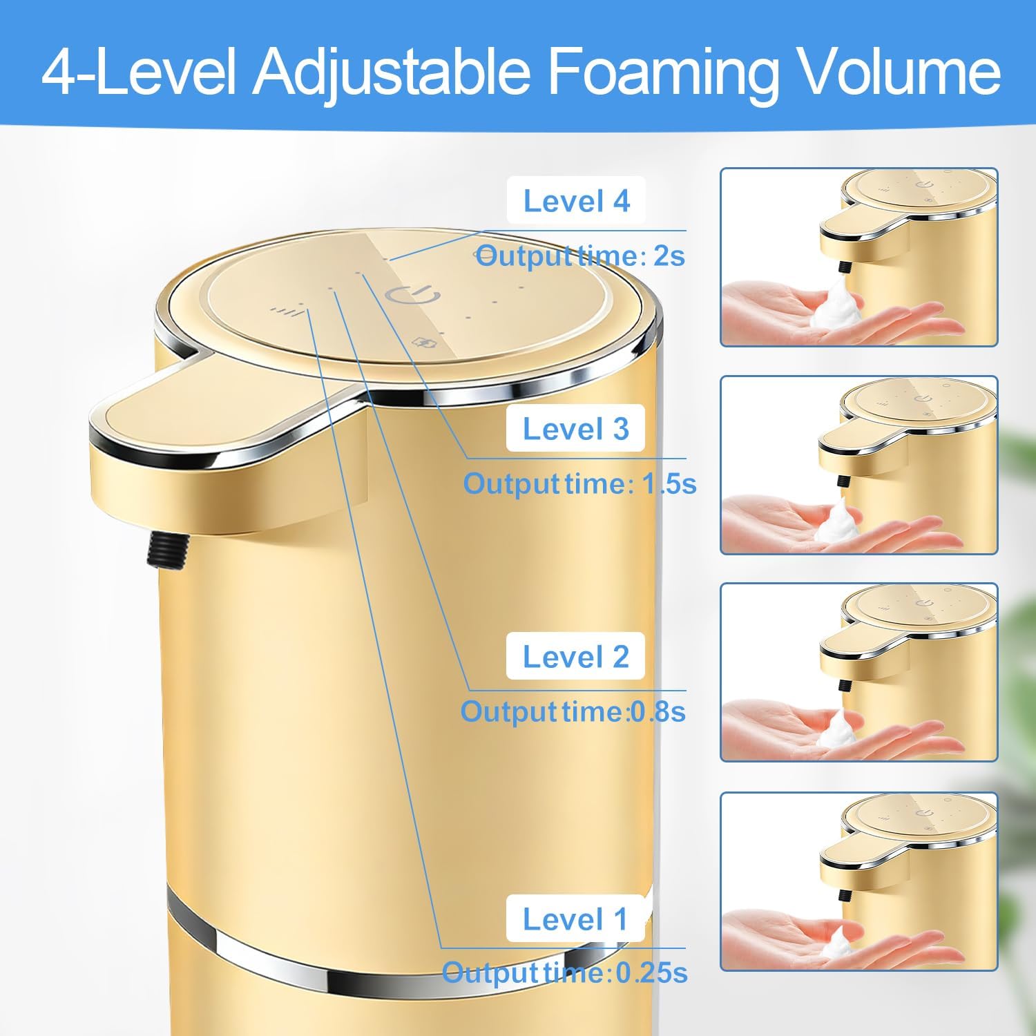 - 🌻【4-Level Foaming Soap Volume Adjustable】-- There are 4 different Foaming soap dispenser settings for options, only by touch the power button once to adjust the soap volume ( And keep pressing the power button for 3seconds to turn on/off the dispenser ). The soap volume weight is 0.5g / 1.5g / 2.4g / 3.2g (Base on each level of soap volume setting) .