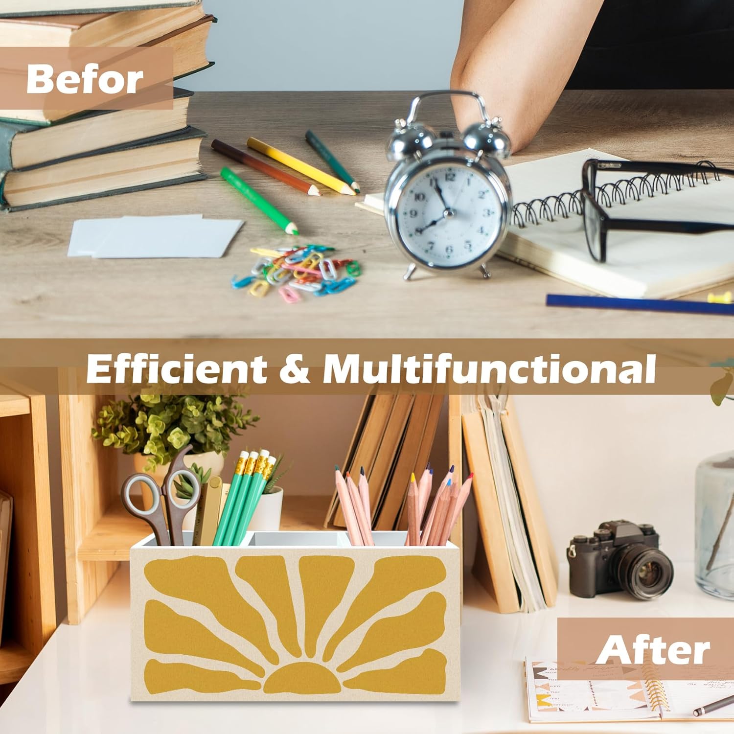 DILSJ Boho Abstract Sunshine Pen Pencil Holder Organizer for Desk, Boho Office Decor, Groovy Retro Abstract Sunshine Wooden Box Signs for Home Office Desk Tabletop Decoration