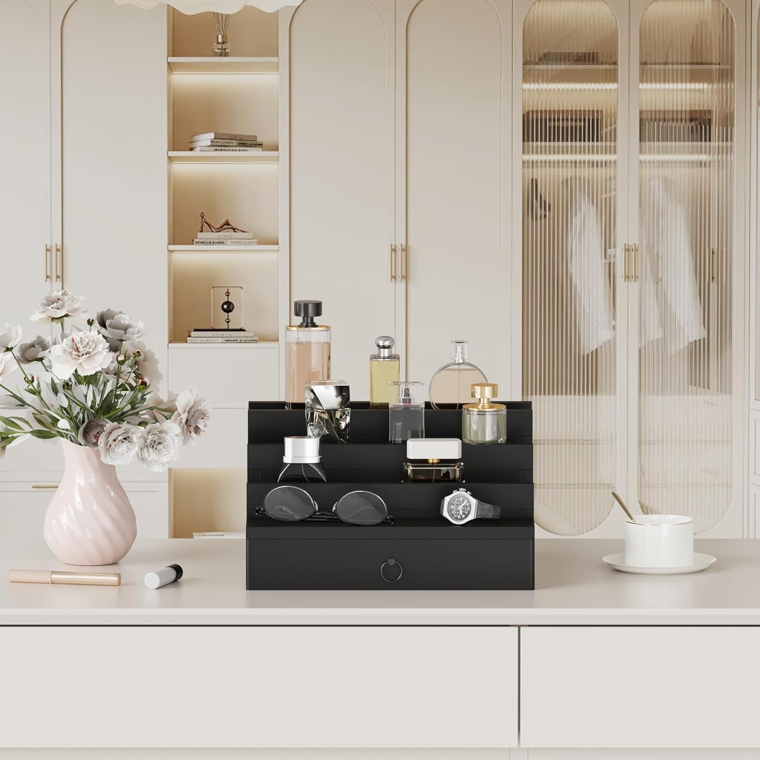 Blisse Cologne/Perfume Organizer, 4-Tier Storage Drawer with Hidden Compartments, Soft-Lined Display Case (Black)