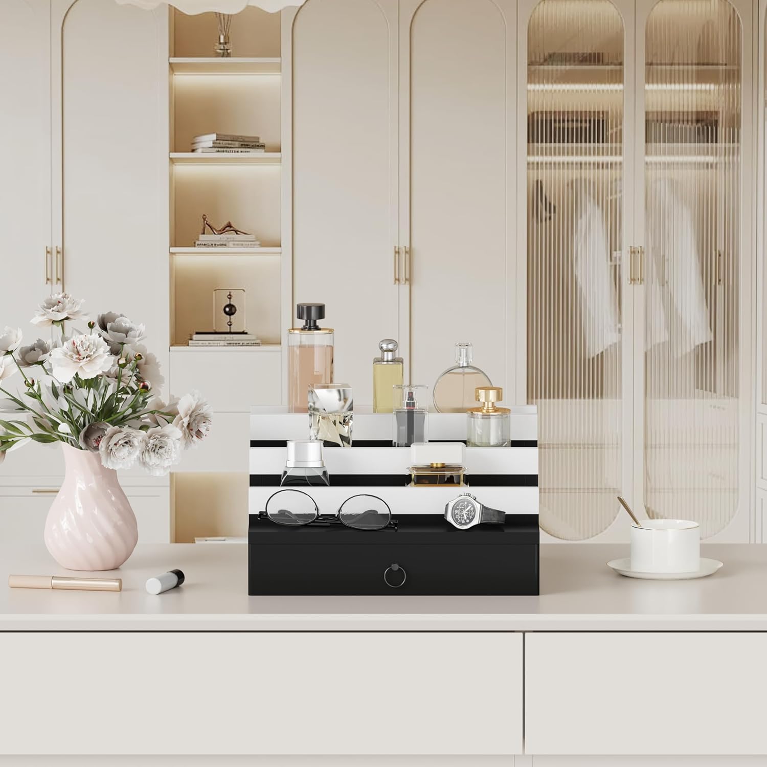 Blisse Cologne/Perfume Organizer, 4-Tier Storage Drawer with Hidden Compartments, Soft-Lined Display Case (Black with White)
