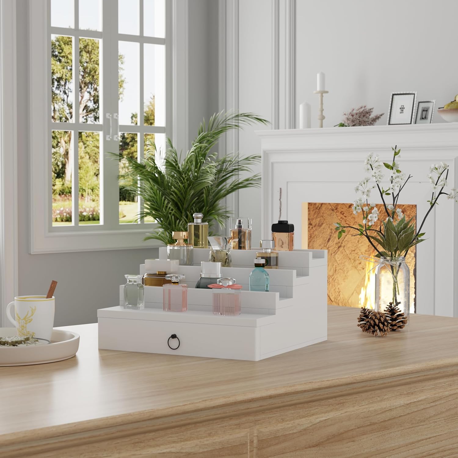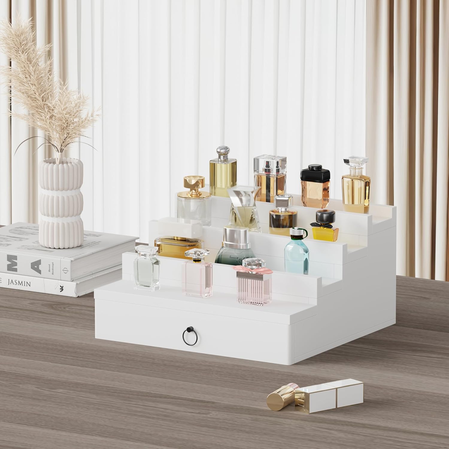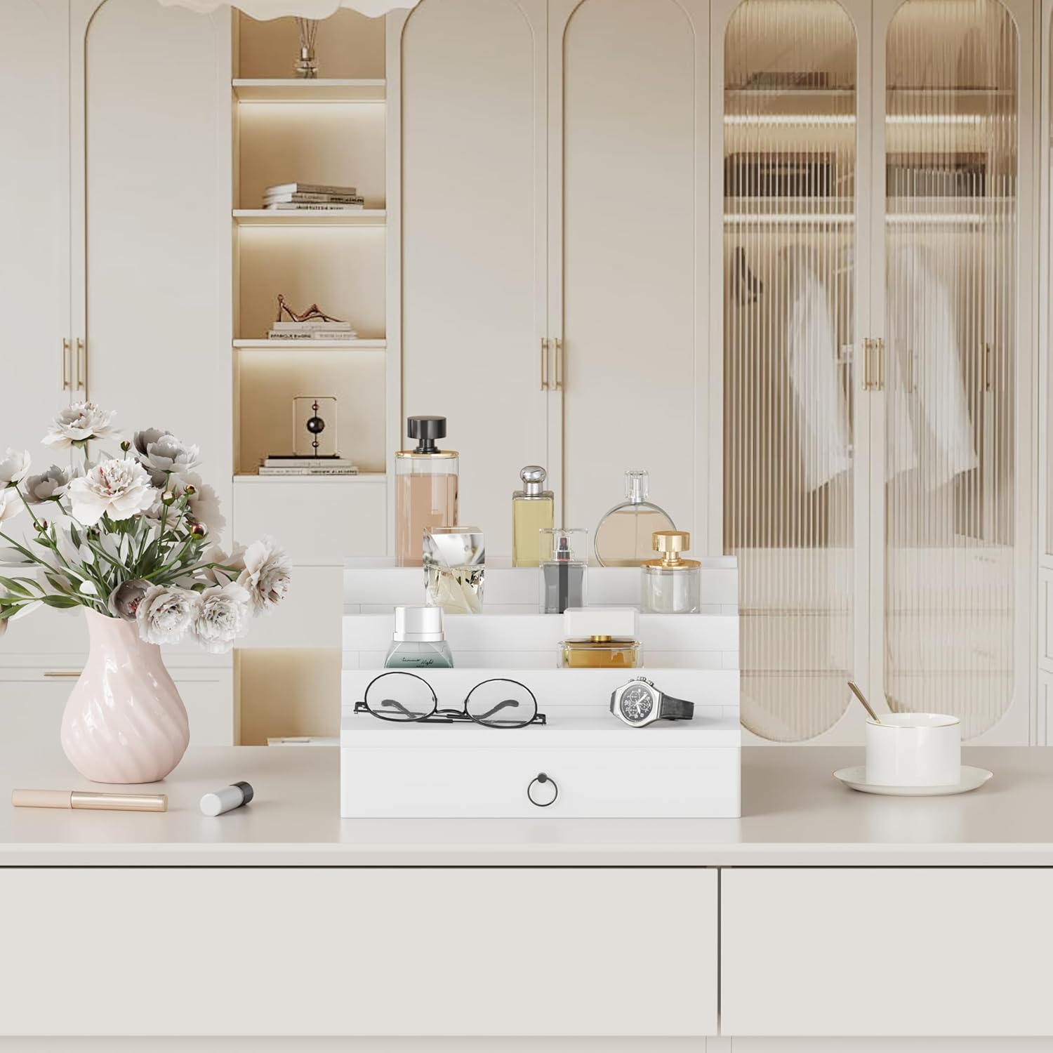 Blisse Cologne/Perfume Organizer, 4-Tier Storage Drawer with Hidden Compartments, Soft-Lined Display Case (White)