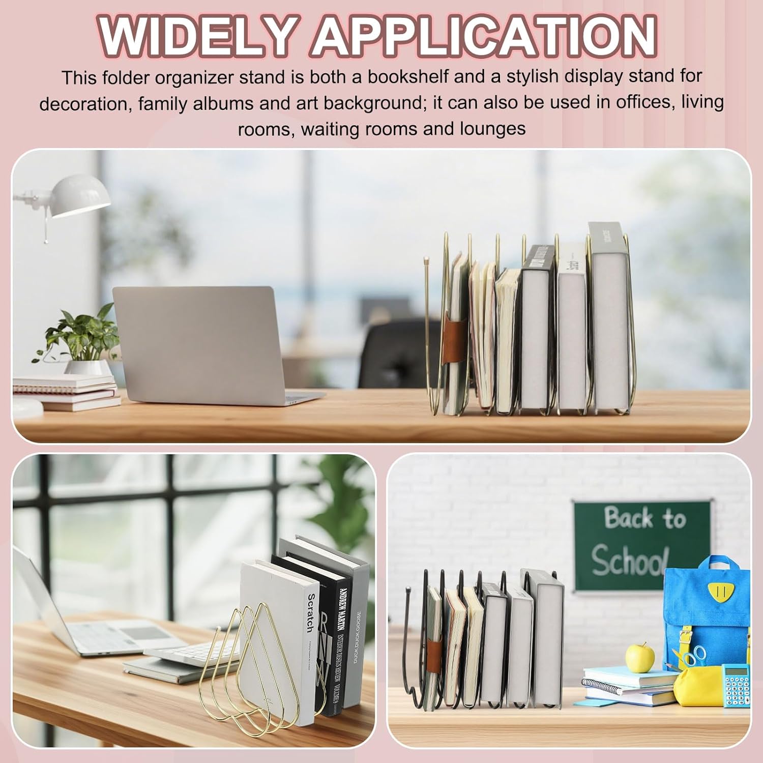 - This folder organizer stand is both a bookshelf and a stylish display stand for decoration, family albums and art background; it can also be used in offices, living rooms, waiting rooms and lounges, providing clear storage space for your files, paperwork, folders, magazines and books, helping you improve your work efficiency at home or in the office.