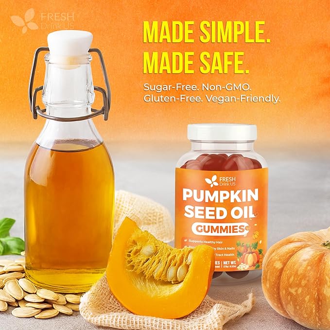 FreshDrinkUS, Premium 90 Pumpkin Seed Oil Gummies For Hair Growth, Youthful Skin, 4000mg Per Serving with Zinc & Vitamin C – Plant-Based, Non-GMO, Sugar/Gluten-Free, Men’s & Women’s Wellness Gummies