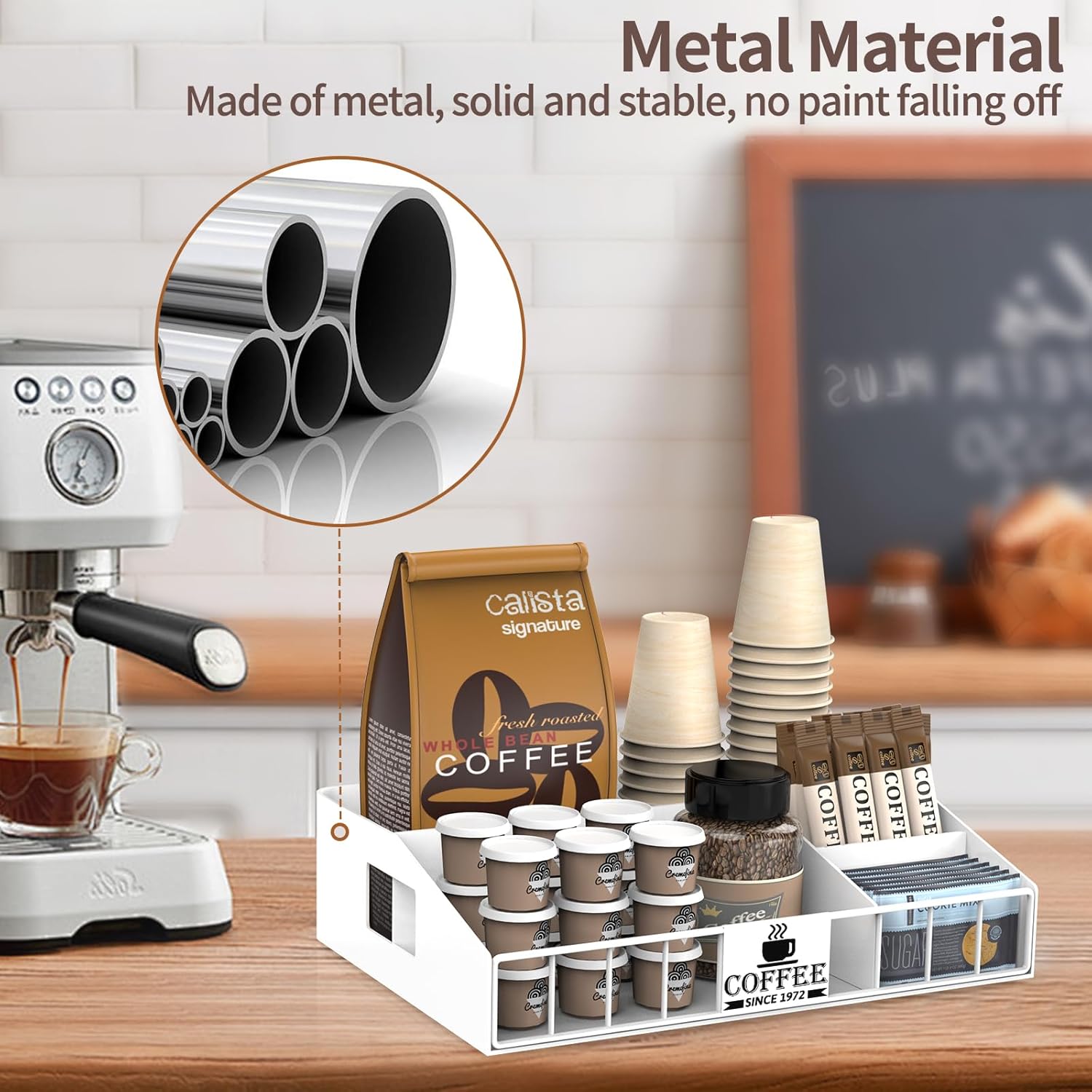 Metal Coffee Station Organizer for Countertop - Coffee Bar Organizer with Designable DIY Logo, K Cup Pods Holder & Tea Condiment Storage - Rustic Breakroom Kitchen Decor in White (1 Pcs)