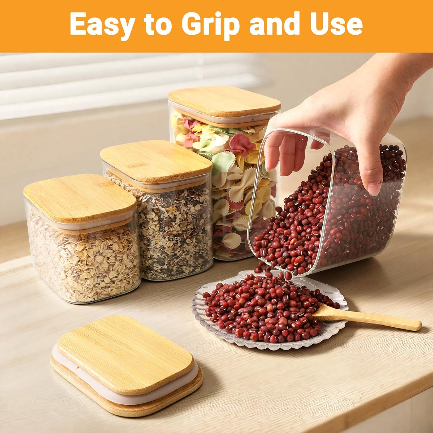 - Easy to Grip and Use - The rectangular shape makes each storage jar easy to grip and handle, even with wet hands. Wide mouth glass canisters are convenient to fill, scoop, and easy to clean. These jars are stackable, space-saving. Perfect for organizing in kitchen cabinets, drawers, or pantry shelves.
