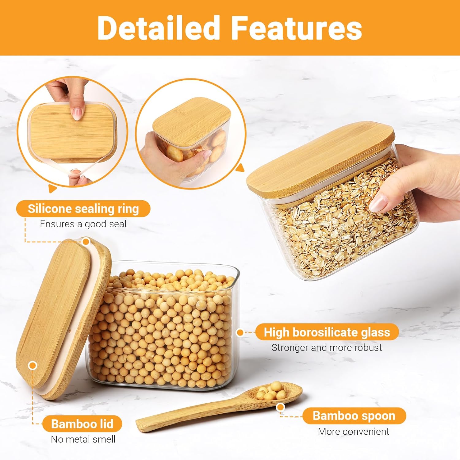 - Glass Containers with Airtight Lids - Each jar features a bamboo lid with a silicone sealing ring, ensuring an airtight closure that keeps food fresh longer and prevents leaks.The included spoon allows you to scoop sugar, coffee, or spices easily, convenient for daily use.