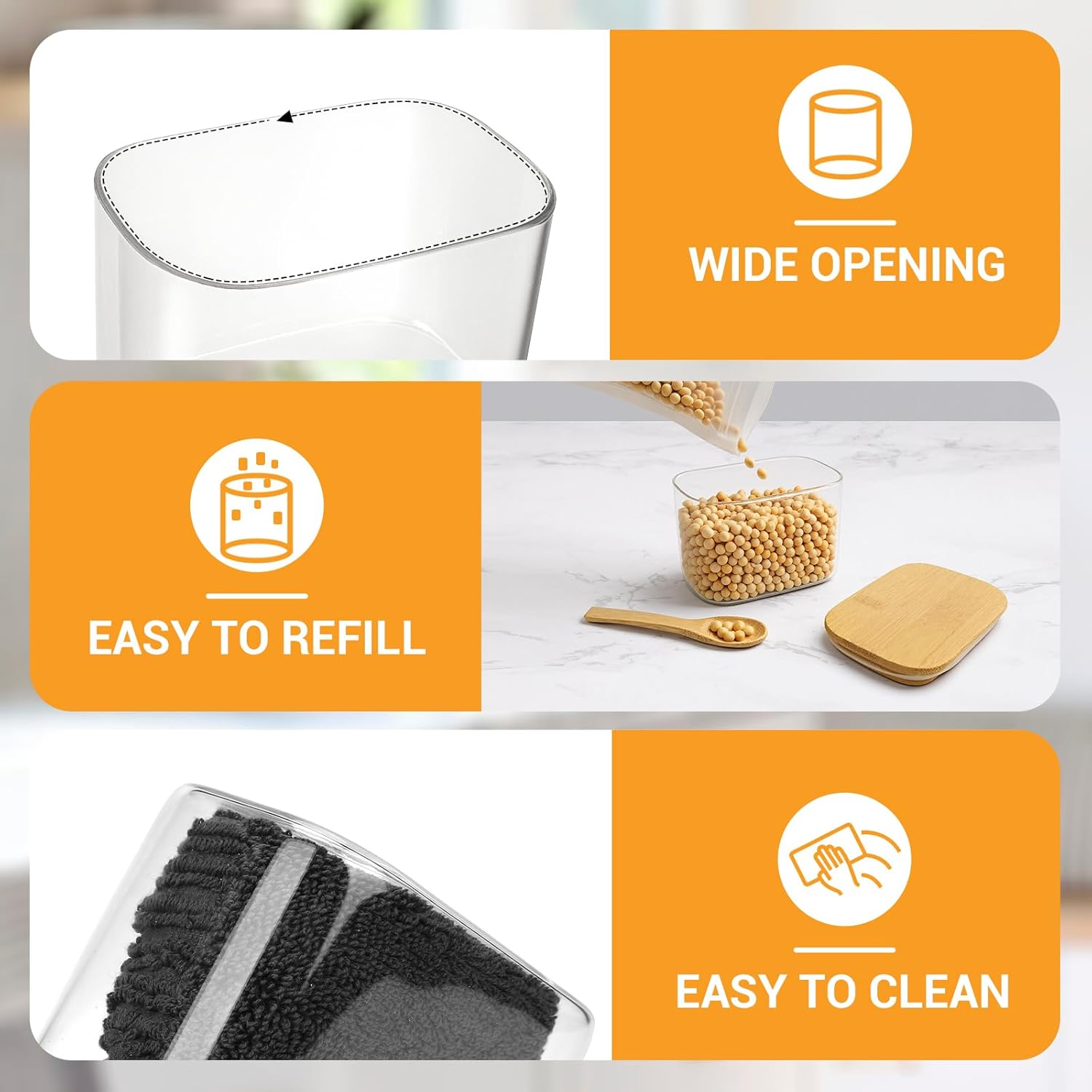 - Easy to Grip and Use - The rectangular shape makes each storage jar easy to grip and handle, even with wet hands. Wide mouth glass canisters are convenient to fill, scoop, and easy to clean. These jars are stackable, space-saving. Perfect for organizing in kitchen cabinets, drawers, or pantry shelves.