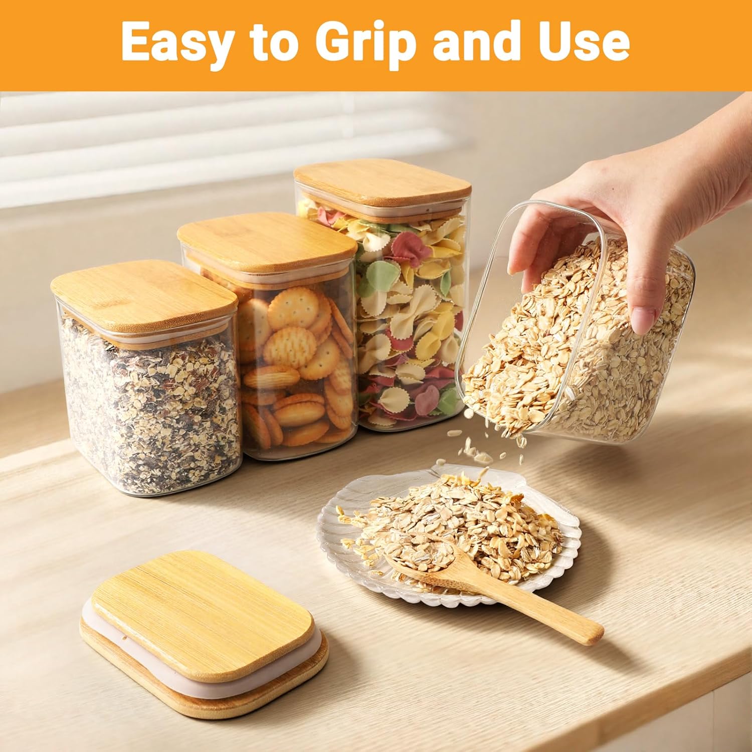 - Glass Containers with Airtight Lids - Each jar features a bamboo lid with a silicone sealing ring, ensuring an airtight closure that keeps food fresh longer and prevents leaks.The included spoon allows you to scoop sugar, coffee, or spices easily, convenient for daily use.