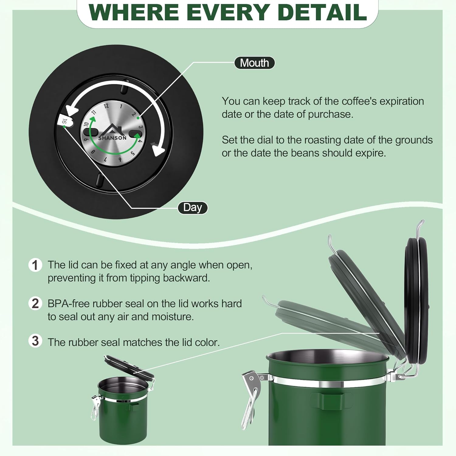 - 【BUILT-IN DATE TRACKER】A simple yet incredibly useful feature! The date tracker lets you monitor when the canister was last filled, helping prevent your coffee from going stale unnoticed. A stainless steel scoop is conveniently attached to the side, so you’re never left searching for a measuring spoon. Features a superior airtight seal for maximum freshness.