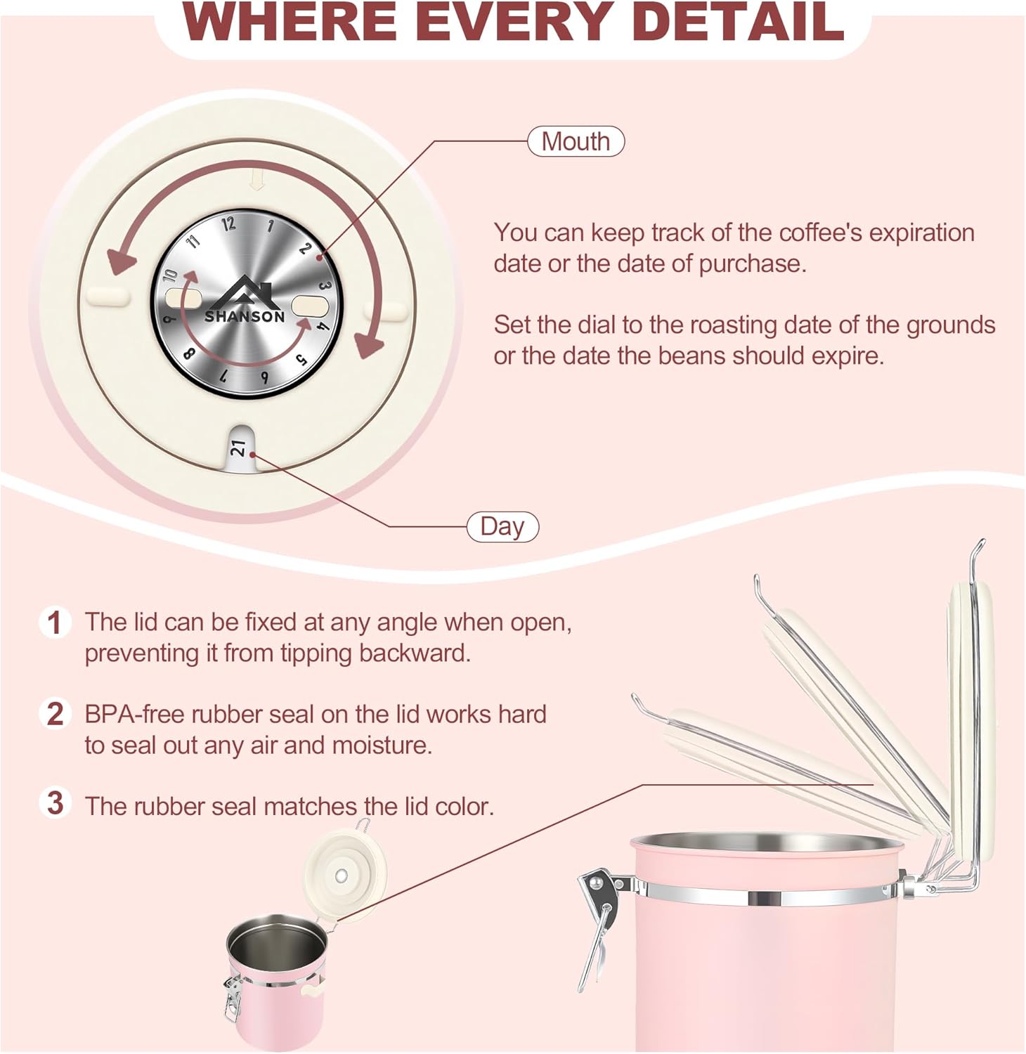 ShanSon Coffee Canister Airtight Coffee Container Stainless Steel Coffee Bean Storage Container with Scoop Coffee Canister for Beans Grounds Sugar Flour Tea Cereal,11OZ, Pink