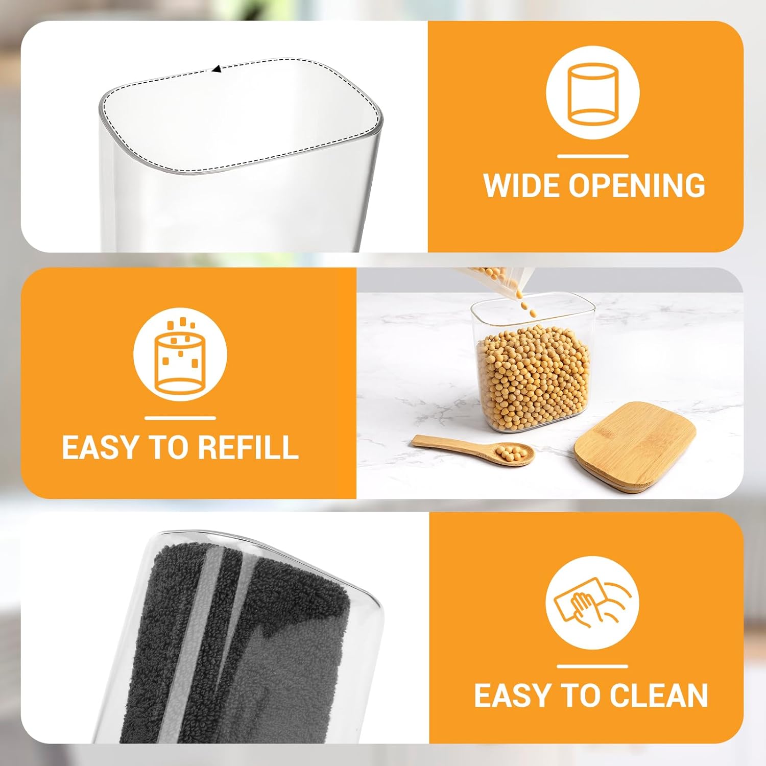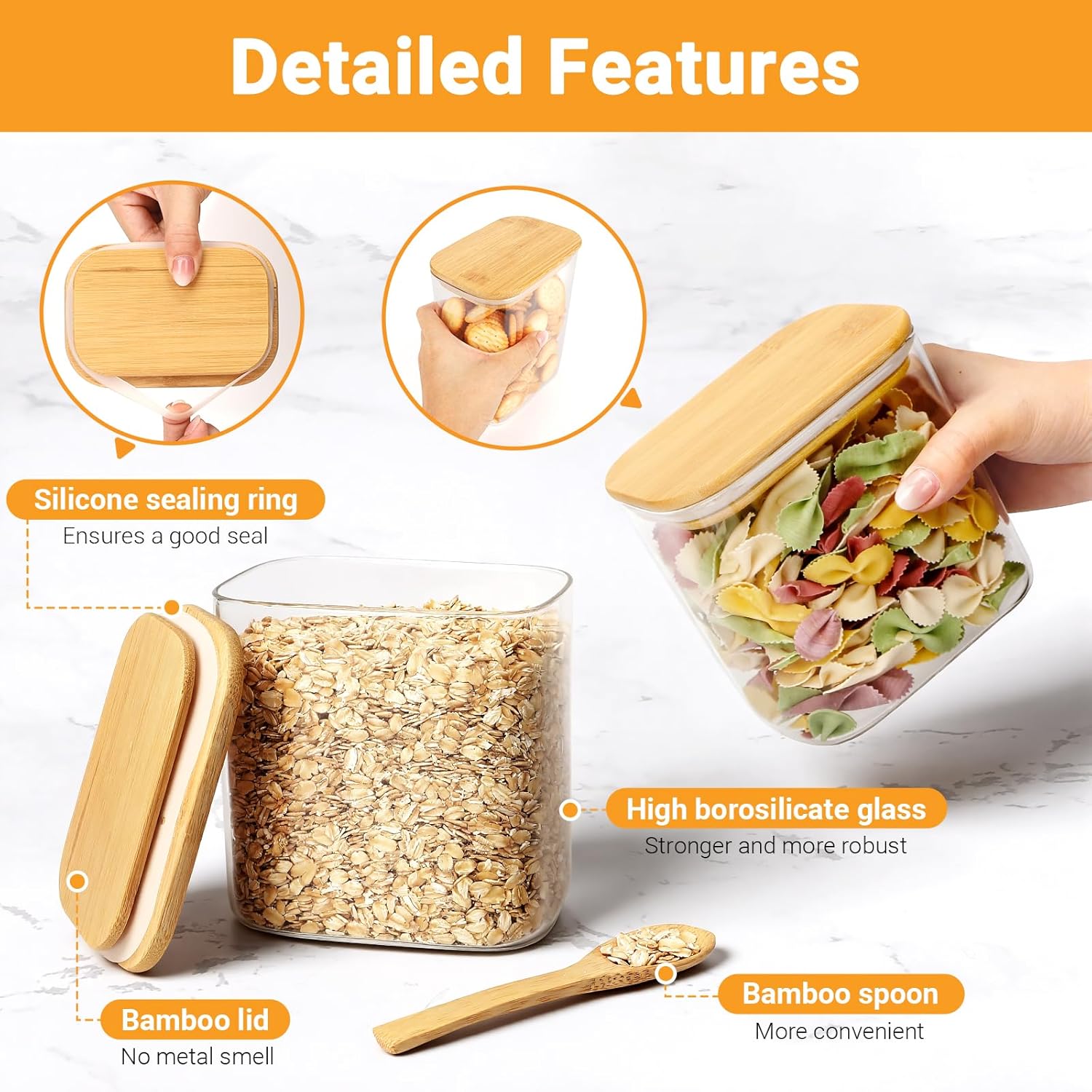 - Glass Containers with Airtight Lids - Each jar features a bamboo lid with a silicone sealing ring, ensuring an airtight closure that keeps food fresh longer and prevents leaks.The included spoon allows you to scoop sugar, coffee, or spices easily, convenient for daily use.