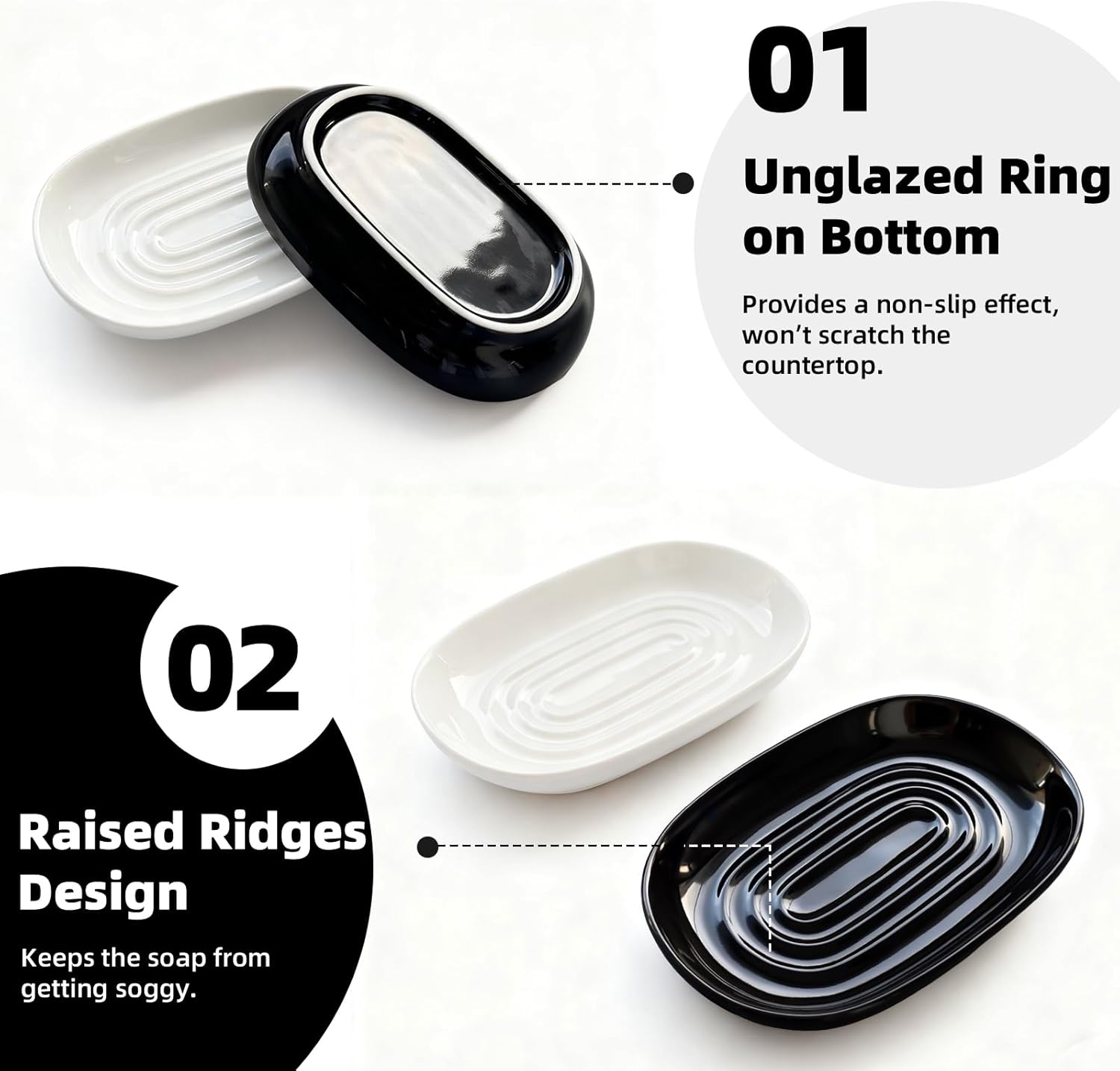 - đ«§ăEffortless to CleanăThe ridged bottom interior raises the soap slightly off the bottom of the dish, provides for proper drainage. While it has no drainage holes, the glazed ceramic surface allows for easy cleaningâsimply rinse with water to remove residue. This soap saver dish also dishwasher-safe, thanks to the high-temperature firing process, ensuring hassle-free maintenance. The unglazed, slightly rough base edge adds subtle anti-slip grip.