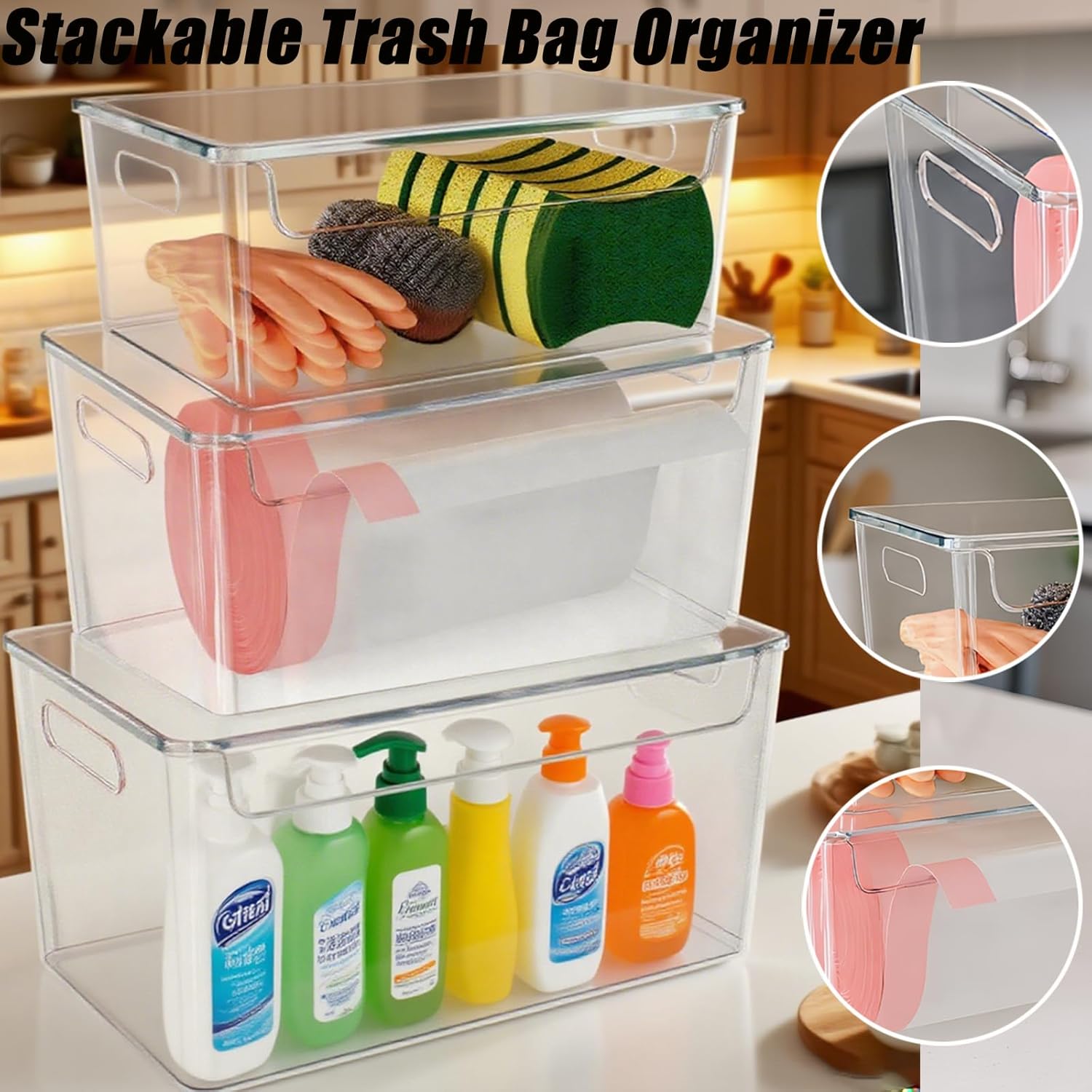 - 【Stackable Design】Built to maximize vertical storage, these garbage bag organizers can be stacked neatly under the sink or in cabinets. Each comes with a lid that keeps rolls dust-free while also adding usable space on top—perfect for storing additional cleaning supplies.