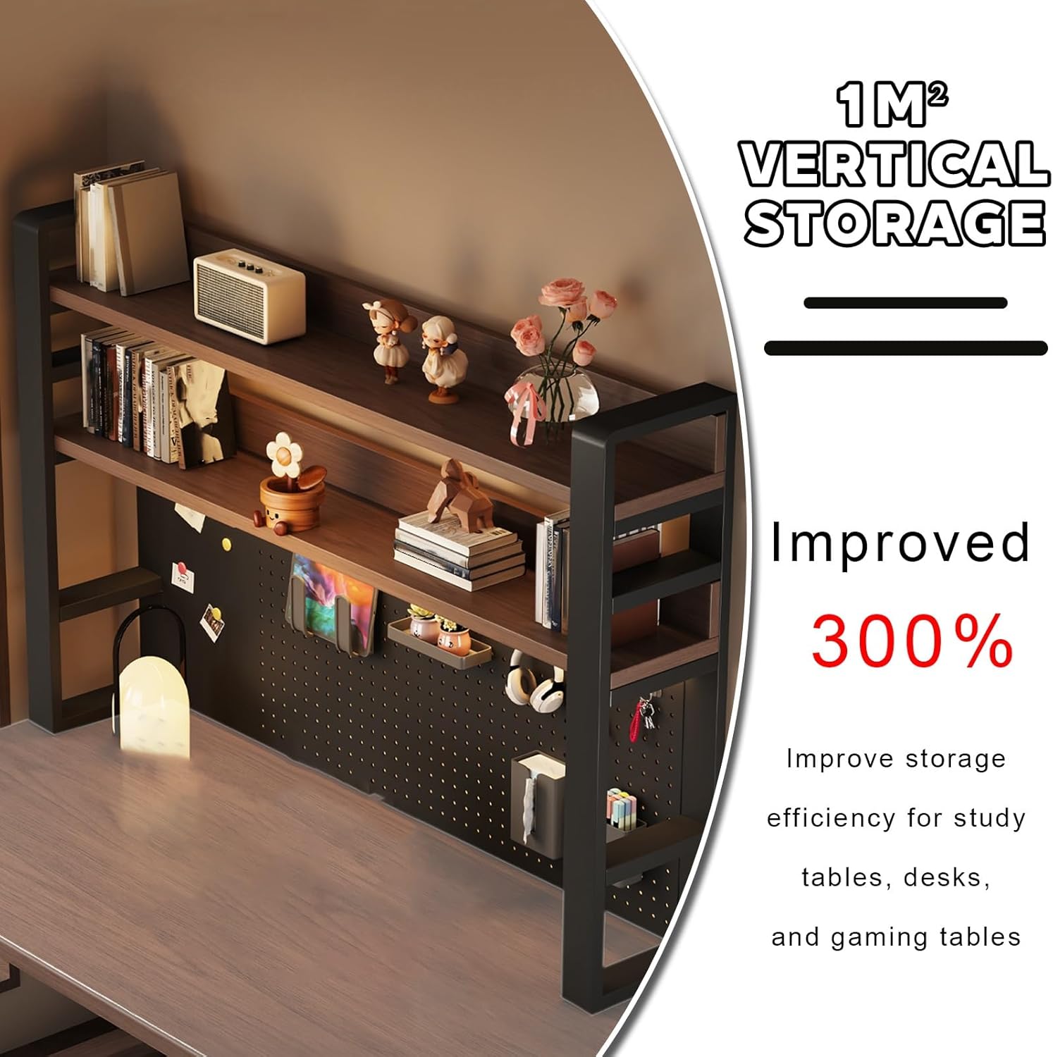 2-Tier Computer Desktop Bookshelf, Metal and Wood Desk Organizer Shelf with Pegboard, Small Freestanding Rack for Gaming, Study, and Display, for Home Office and Dorm