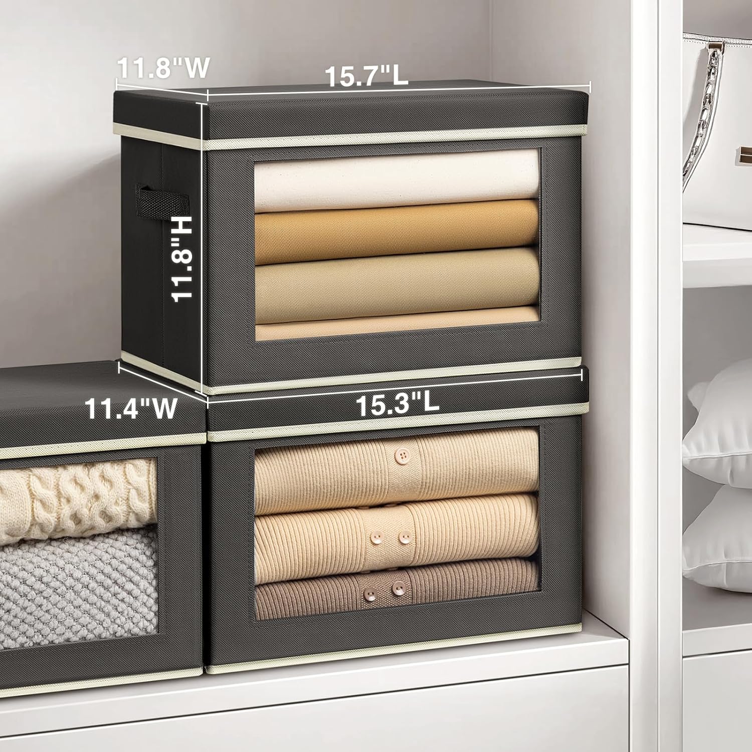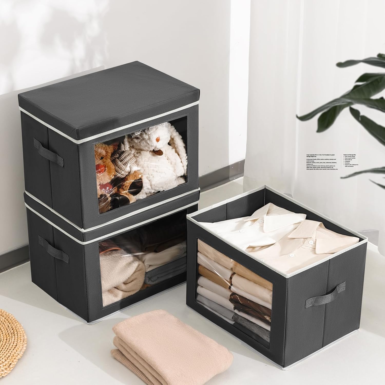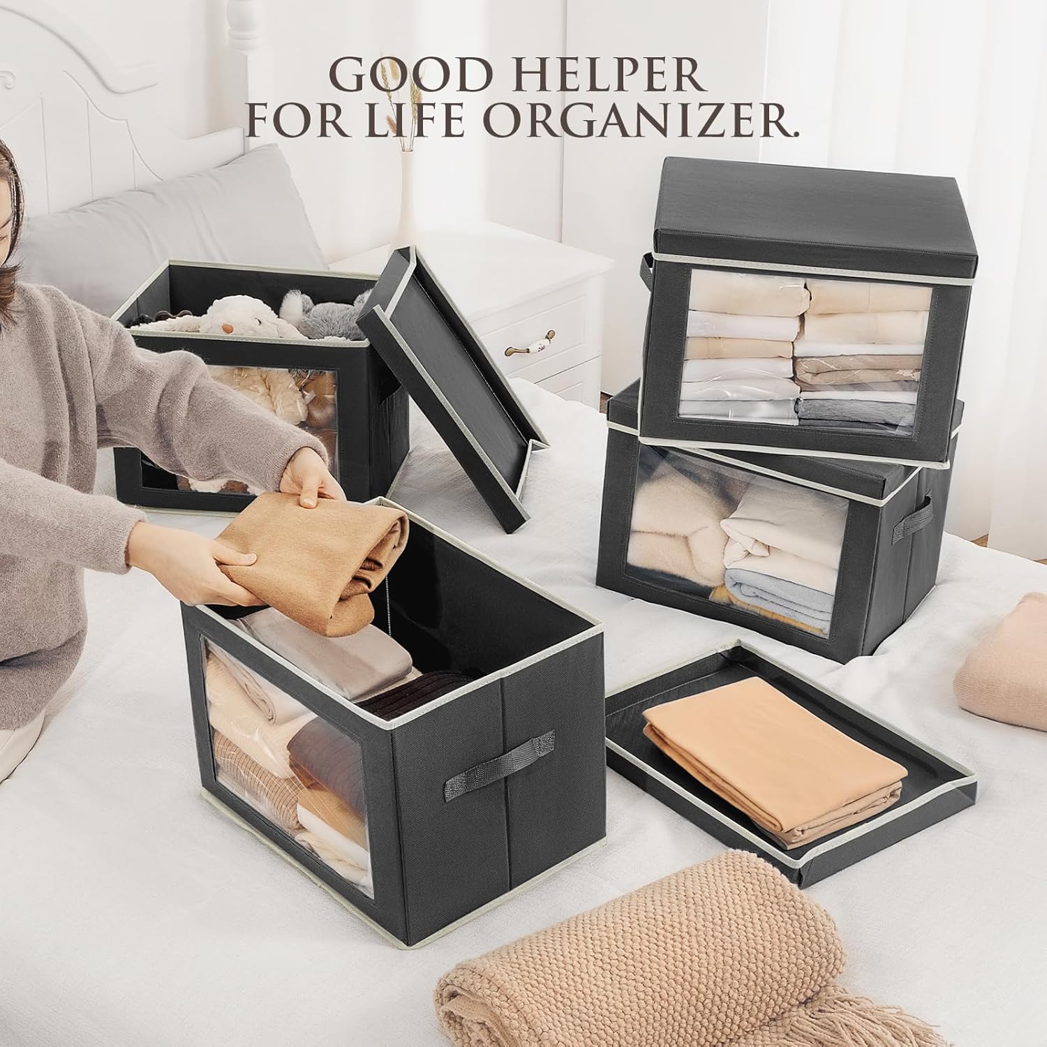 Stackable Storage Bins with Lids - Large Storage Box with Lids, Foldable Closet Boxes for Organizing, Wardrobe Clothes Organizer with Window, Cubes Bins for Living Room, 6 Pack, Dark Grey