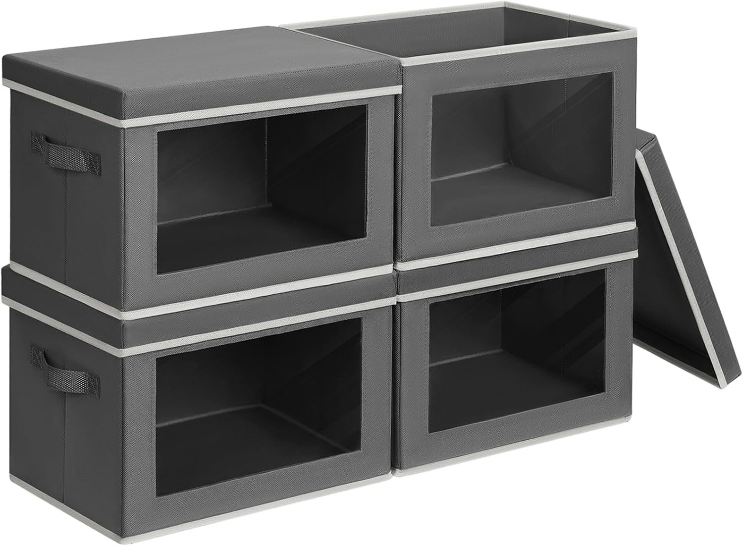 Stackable Storage Bins with Lids - Large Storage Box with Lids, Foldable Closet Boxes for Organizing, Wardrobe Clothes Organizer with Window, Cubes Bins for Living Room, 4 Pack, Dark Grey