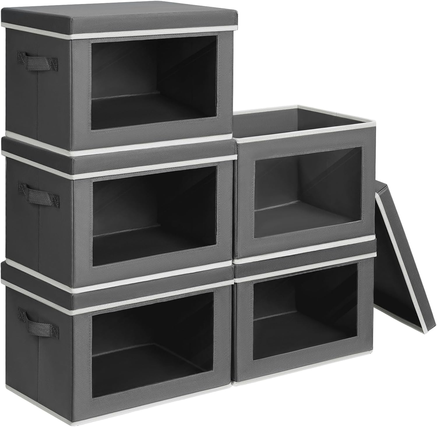 Stackable Storage Bins with Lids - Medium Storage Box with Lids, Foldable Closet Boxes for Organizing, Wardrobe Clothes Organizer with Window, Cubes Bins for Living Room, 5 Pack, Dark Grey