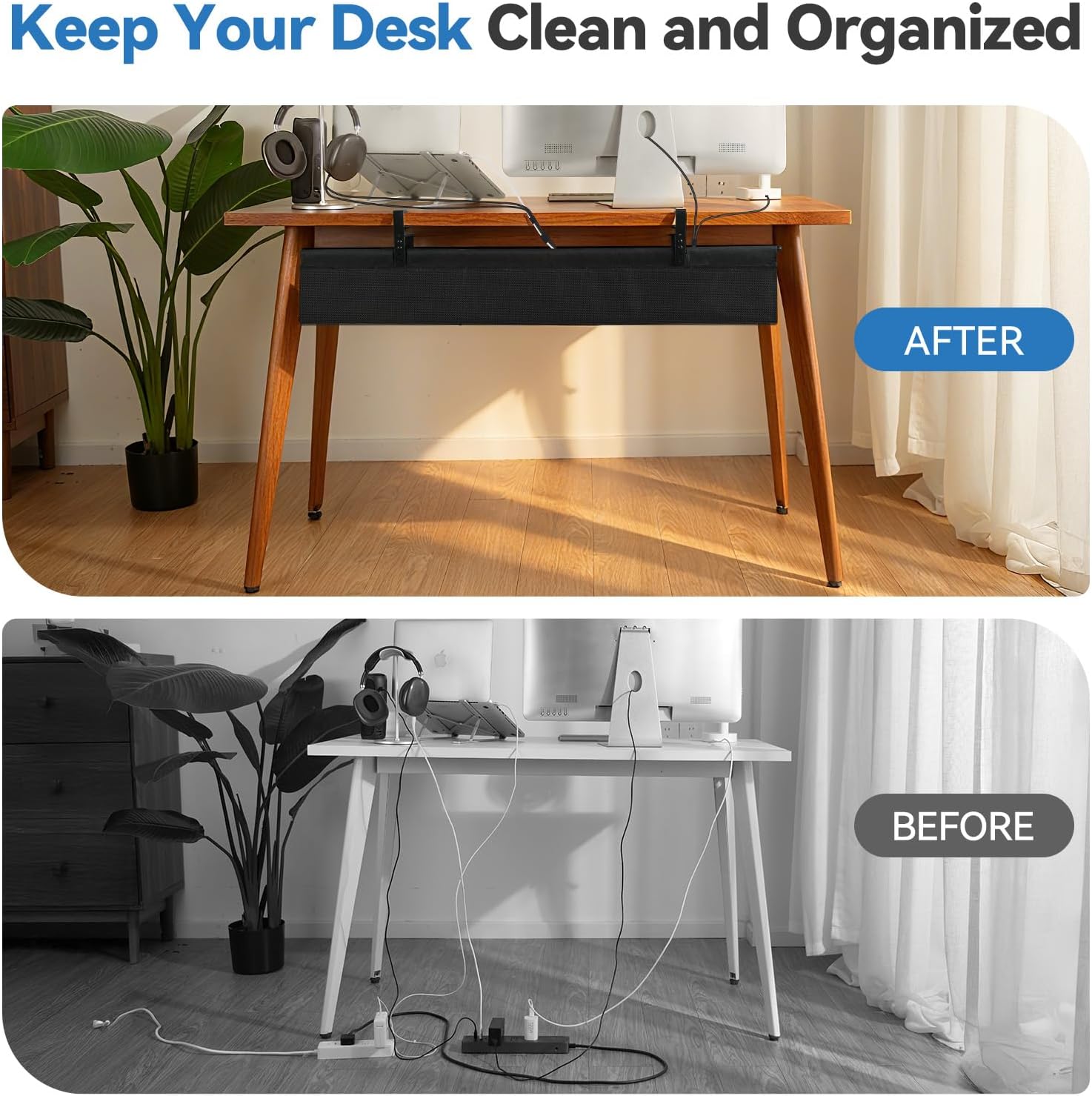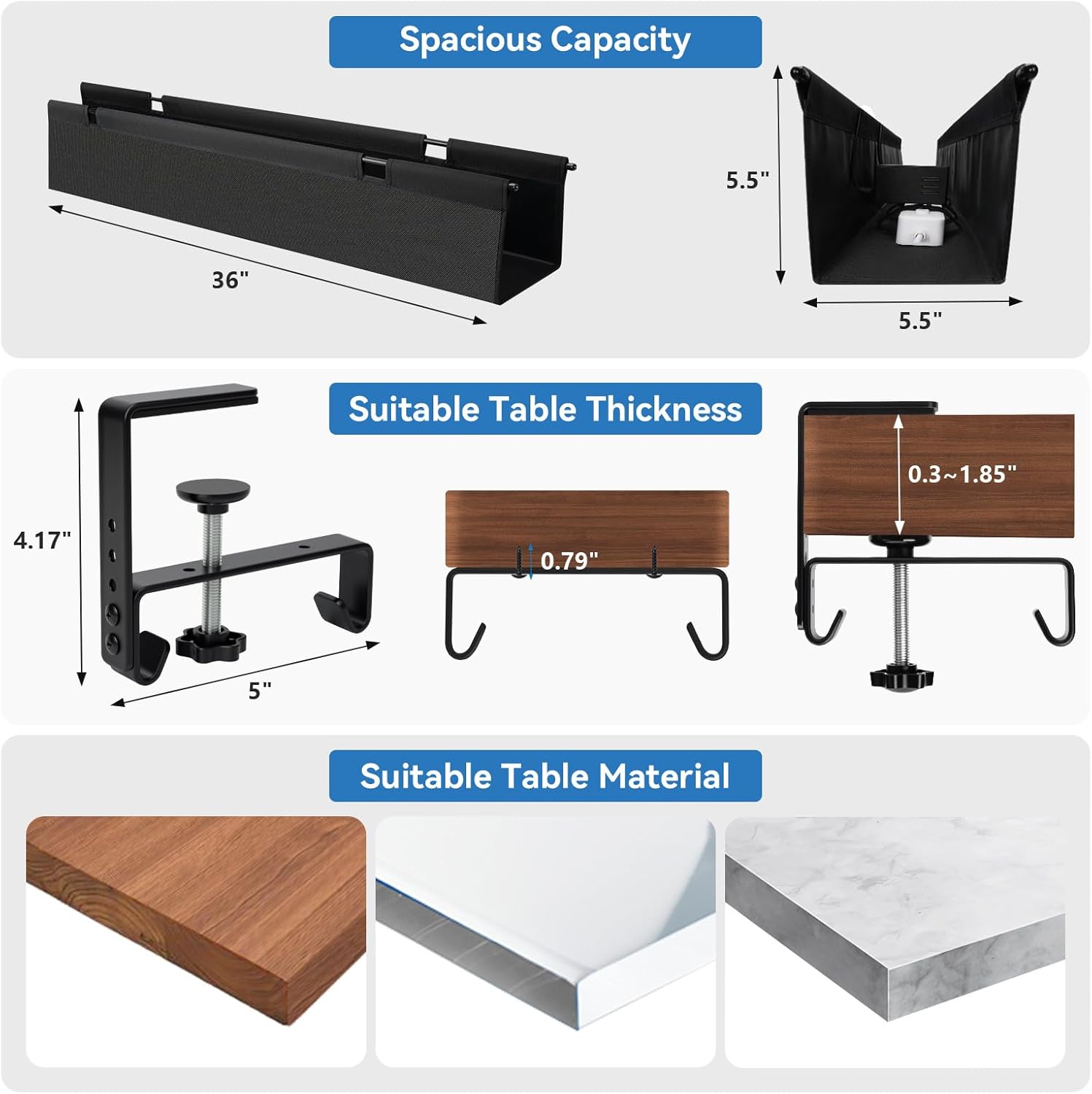 - [Hide and Organize Cables Effectively] Engineered for both generous storage and rugged reliability, this spacious cable management tray (36"L x 5.5"W x 5.5"H) easily accommodates even the bulkiest adapters and power strips—keeping every cord neatly organized and completely hidden under your desk for a clean, clutter-free workspace that lasts.