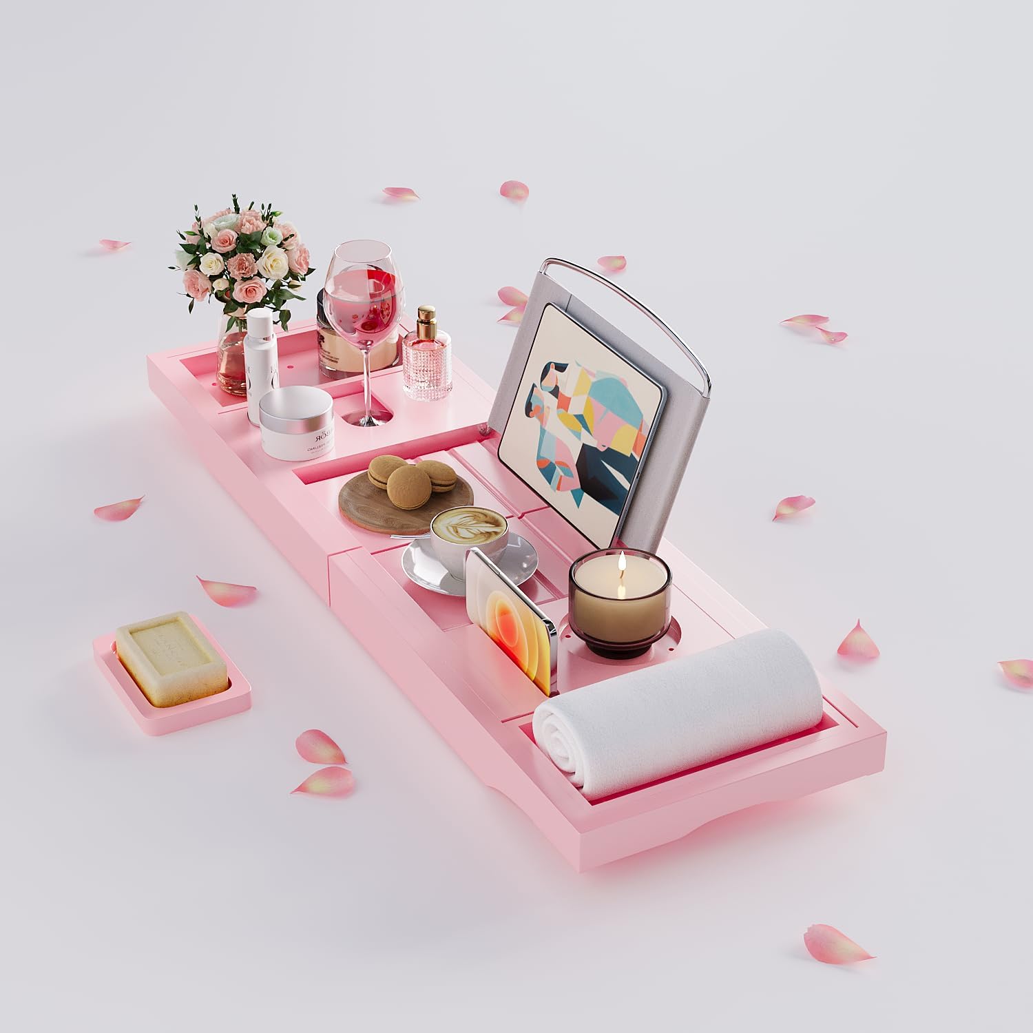 Foldable Bathtub Caddy Tray, Bamboo Bath Tub Tray Table for Tub with Wine Glass Holder Book Phone Tablet Holder with Extending Sides, Adjustable Bathroom Bathtub Free Soap Holder Gift Idea (Pink)