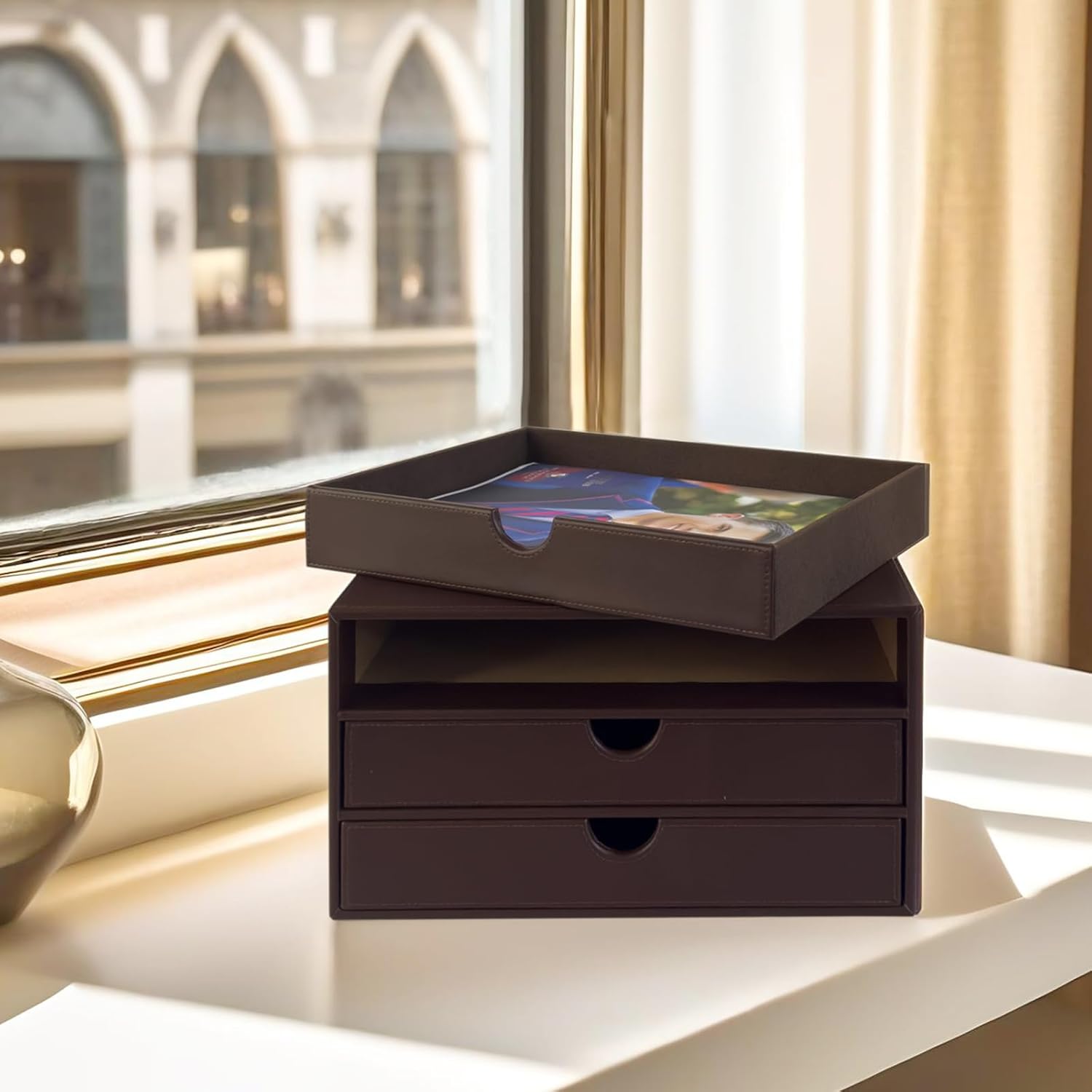 - šļø Aesthetically Pleasing: Say goodbye to cheap plastic document organizer. Made of high density wooden board and covered with selected faux leather exterior and non-woven lining interior, this one could withstand frequent use, making it a long-lasting and cost-effective organizational solution. A must-have accessory for anyone who wants to add a touch of personality to your desk organization
