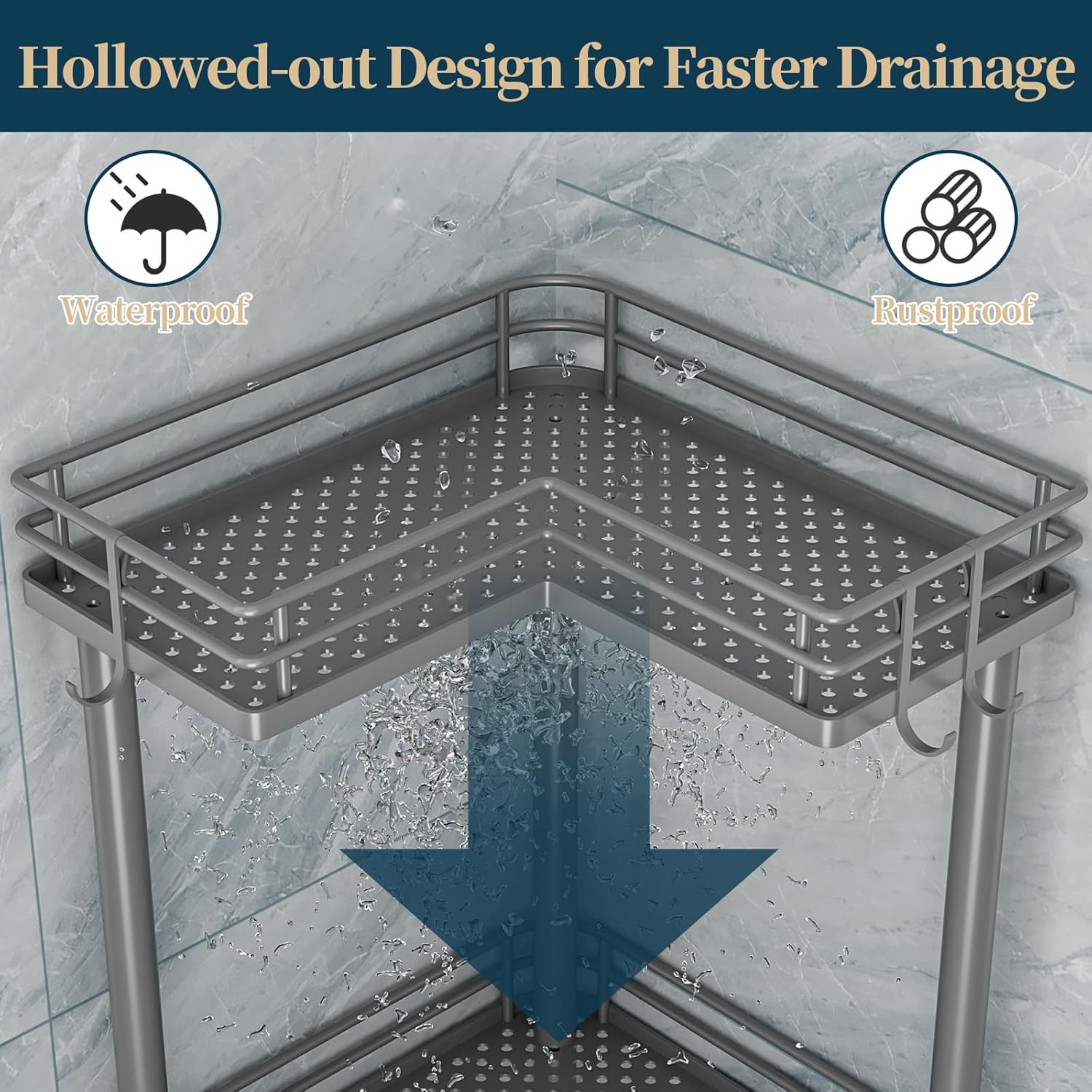 - [Efficient Drainage Design]: With drainage holes integrated into the shower baskets, this corner shower caddy prevents water buildup, keeping your items dry and clean. Say goodbye to soggy shelves and enjoy a fresh bathroom experience