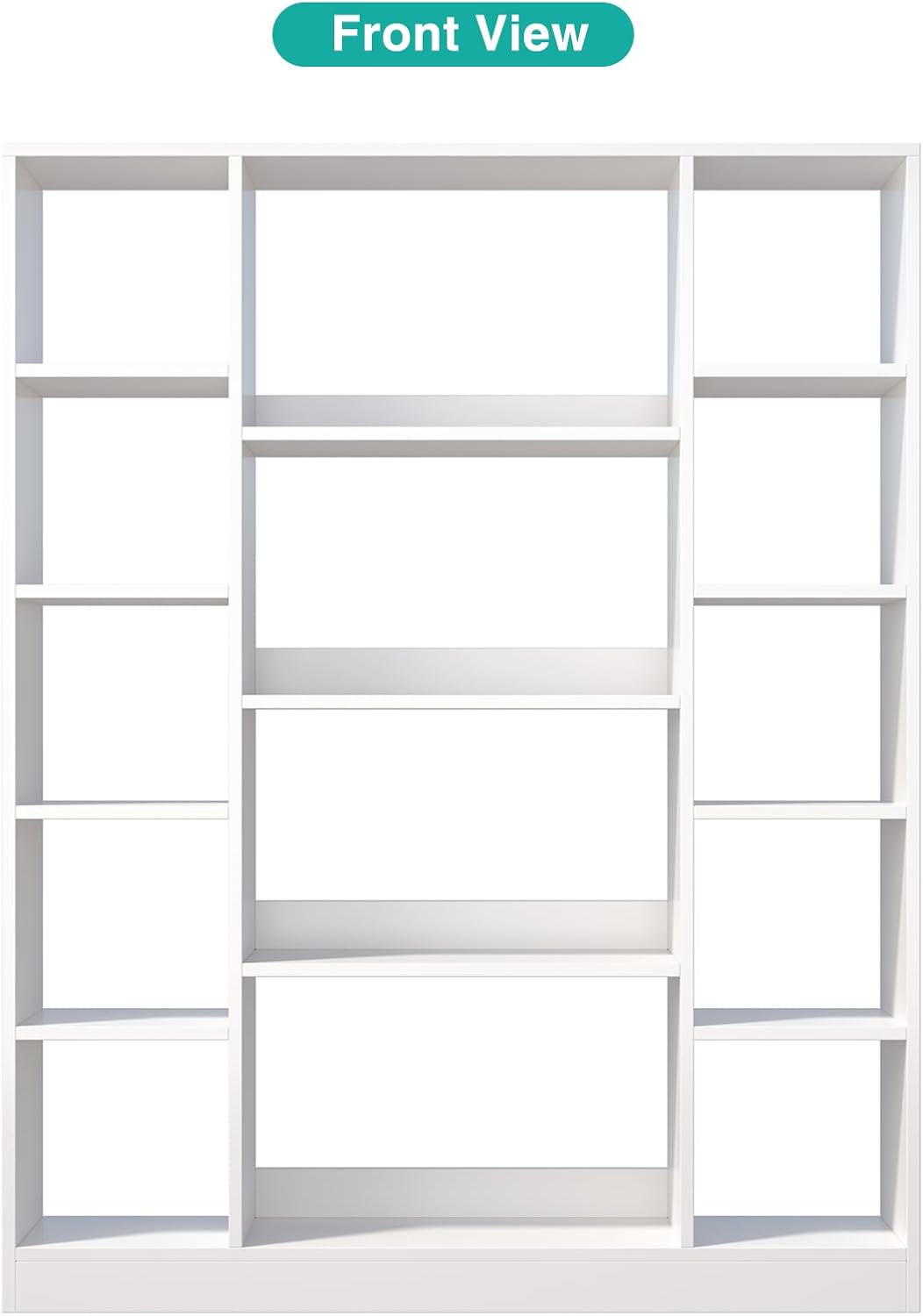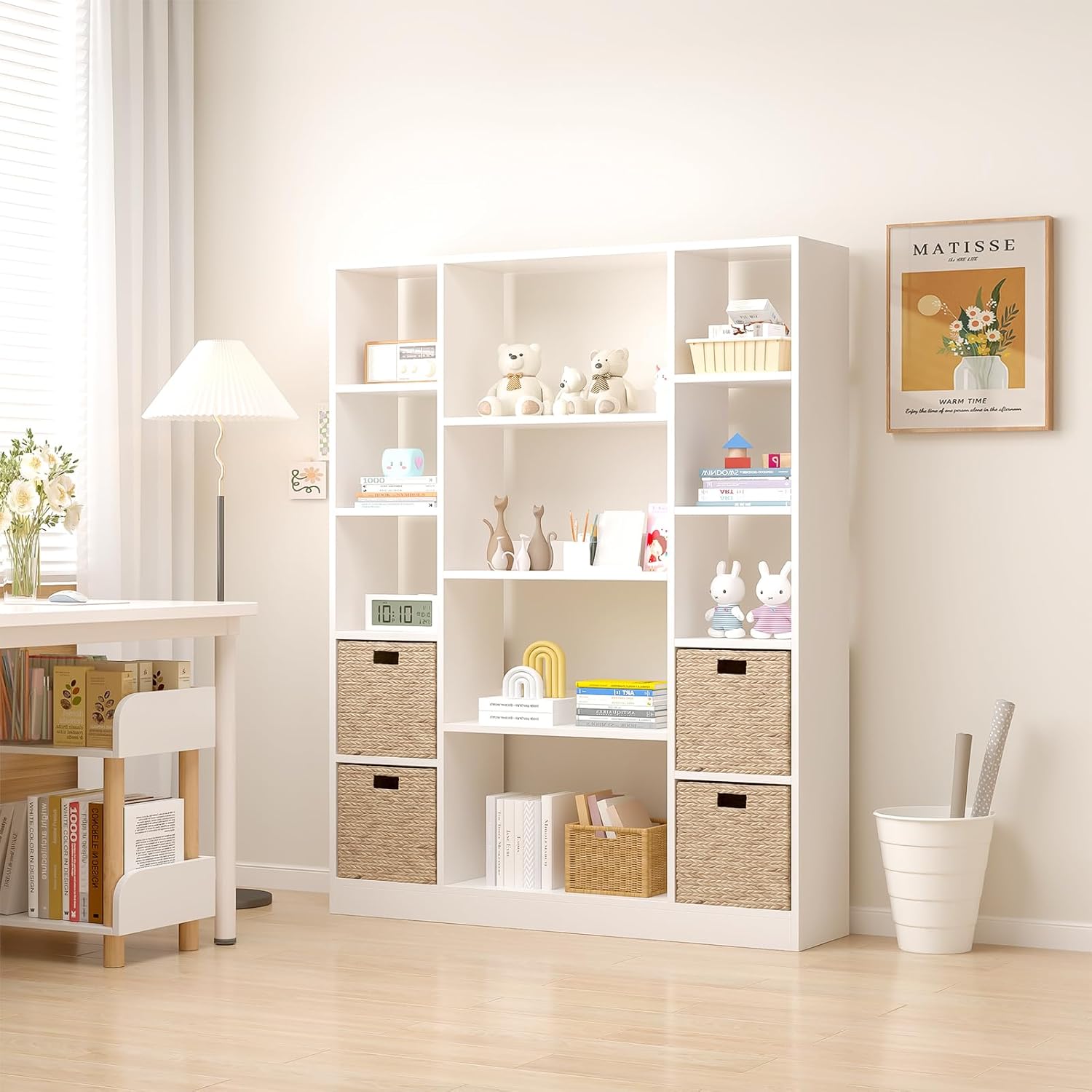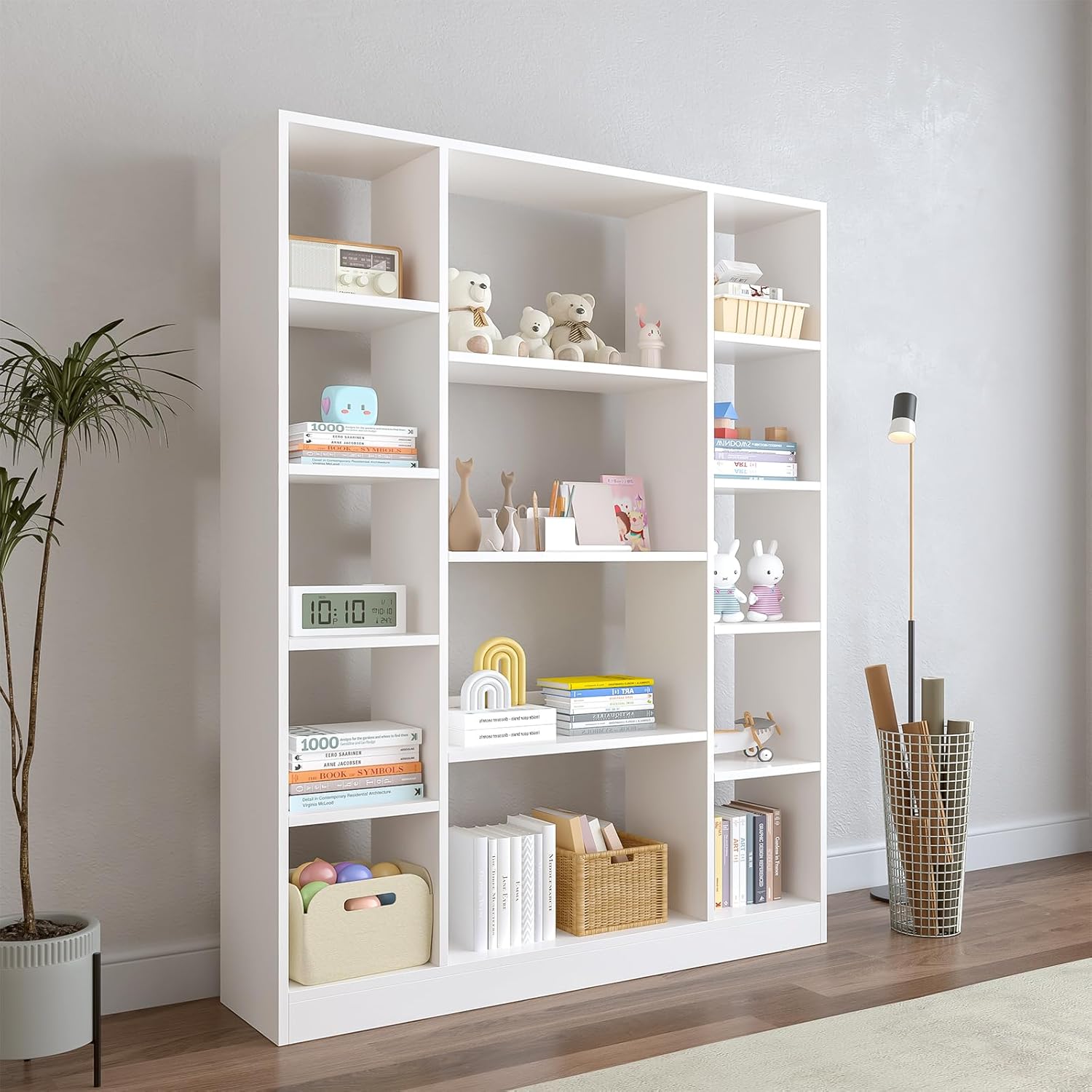 Cube Storage Bookcase with Base - Large Wooden Bookshelf with 10 Open Cubes and 4 Shelves for Home and Office, Freestanding Organizer, White