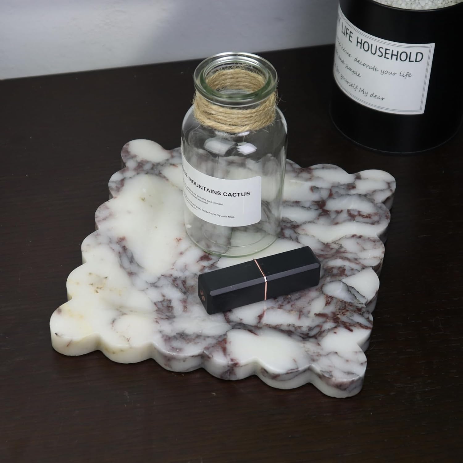 Square Marble Decorative Tray with Scalloped Edge, Luxury Natural Stone Bathroom Vanity Tray, Dresser Top Perfume Coffee Home Kitchen Sink Tray, Key Trinket Ring