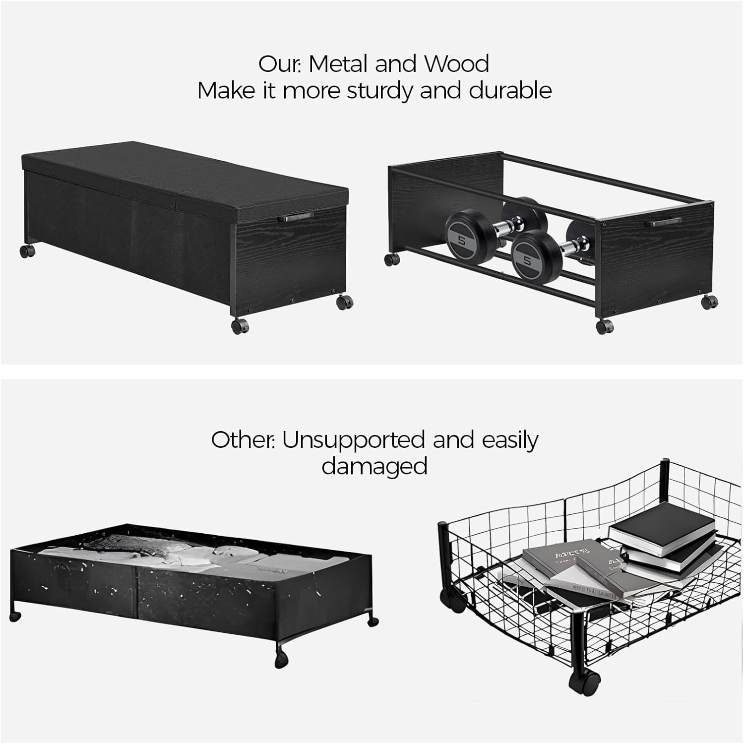- 【STURDY UNDER BED STORAGE】 The sturdiness of metal paired with the style of wood provides a more beautiful appearance compared to polyester fabric, while the load-bearing capacity and durability are dramatically increased to a maximum of 70 pounds.