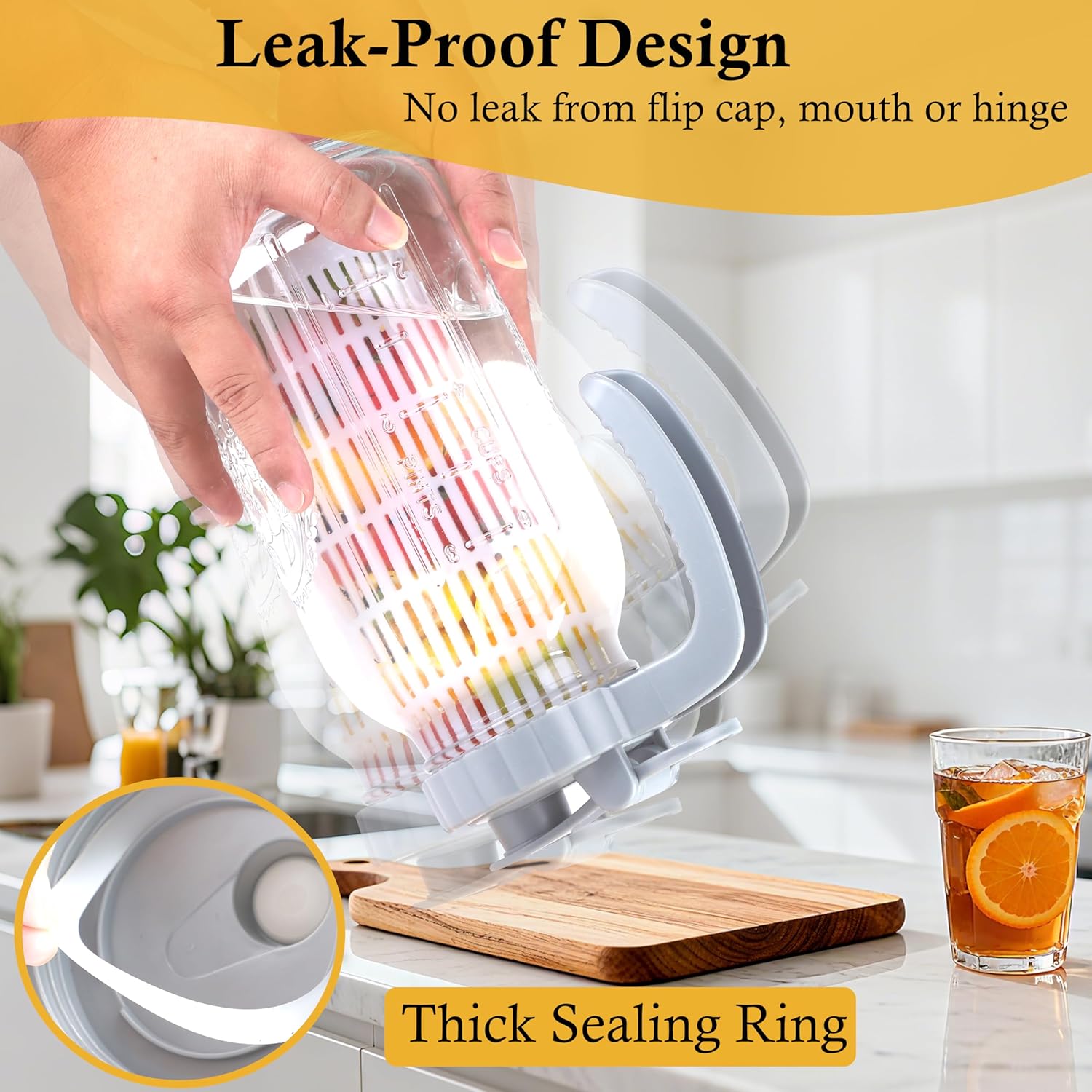 - Leak Proof & Airtight - Glass mason jar water pitcher with Food grade silicone seal that will ensure not leak what so ever ,even while shaking it upside-down. The top flip cap is also Airtight so that when in the fridge it’s not potentially letting in smells from foods or anything.