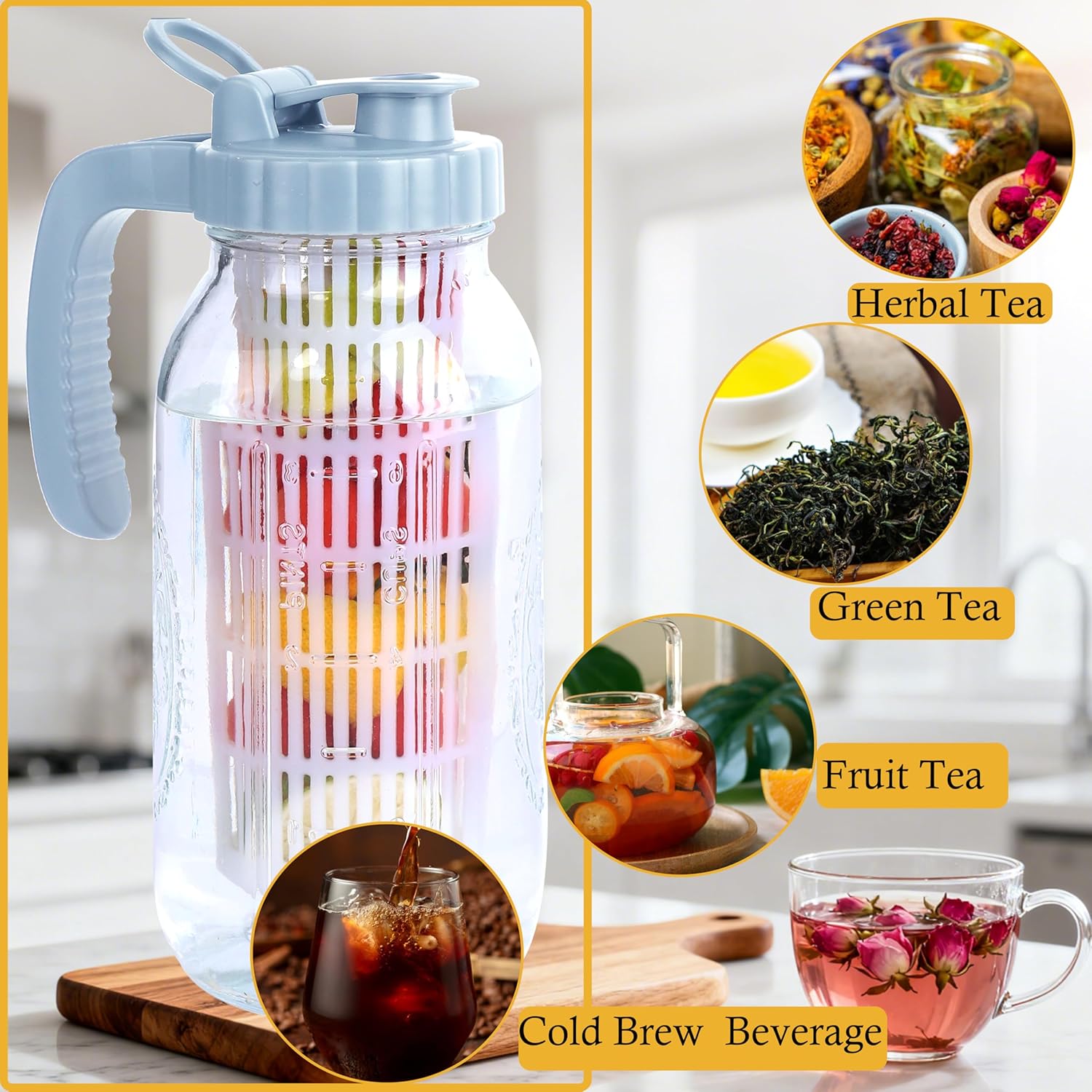 64 Oz Glass Pitcher With Infuser Lid Half Gallon Mason Ja Fruit Infused Cold Hot Water Pitcher 2 Quart Wide Mouth Sun Tea Jar For Outside For Fridge Lemonade, Beverage,Milk,Juice, Cold Brew Container
