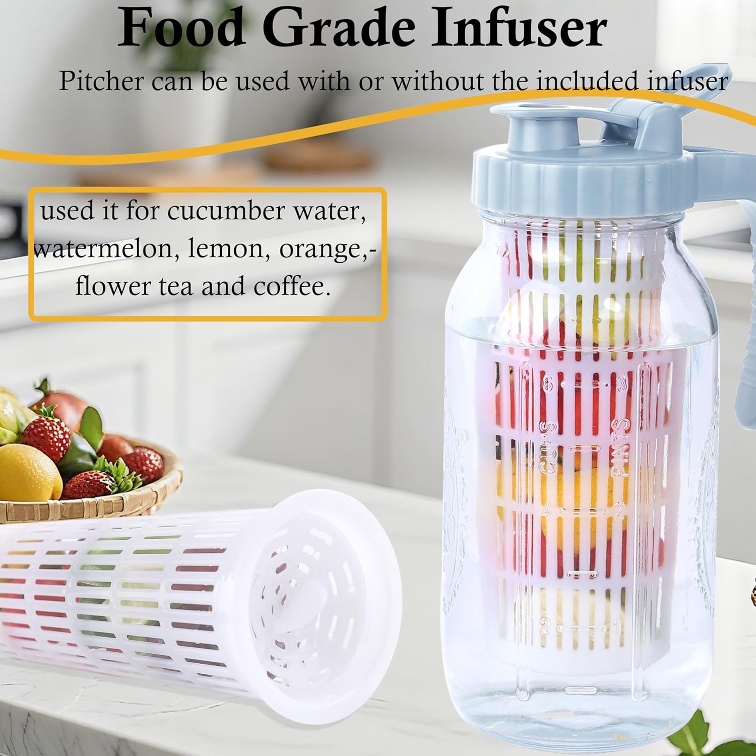 - Heavy Duty Glass - 64 oz Glass mason jar water pitcher with infuser is made of heavy duty glass that is thick, strong, can be for Cold / Boiling Water. Bulit in Food grade infuser non toxic, BPA free, lead free, safe and healthy for your families. This pitcher can be used with or without the included infuser.