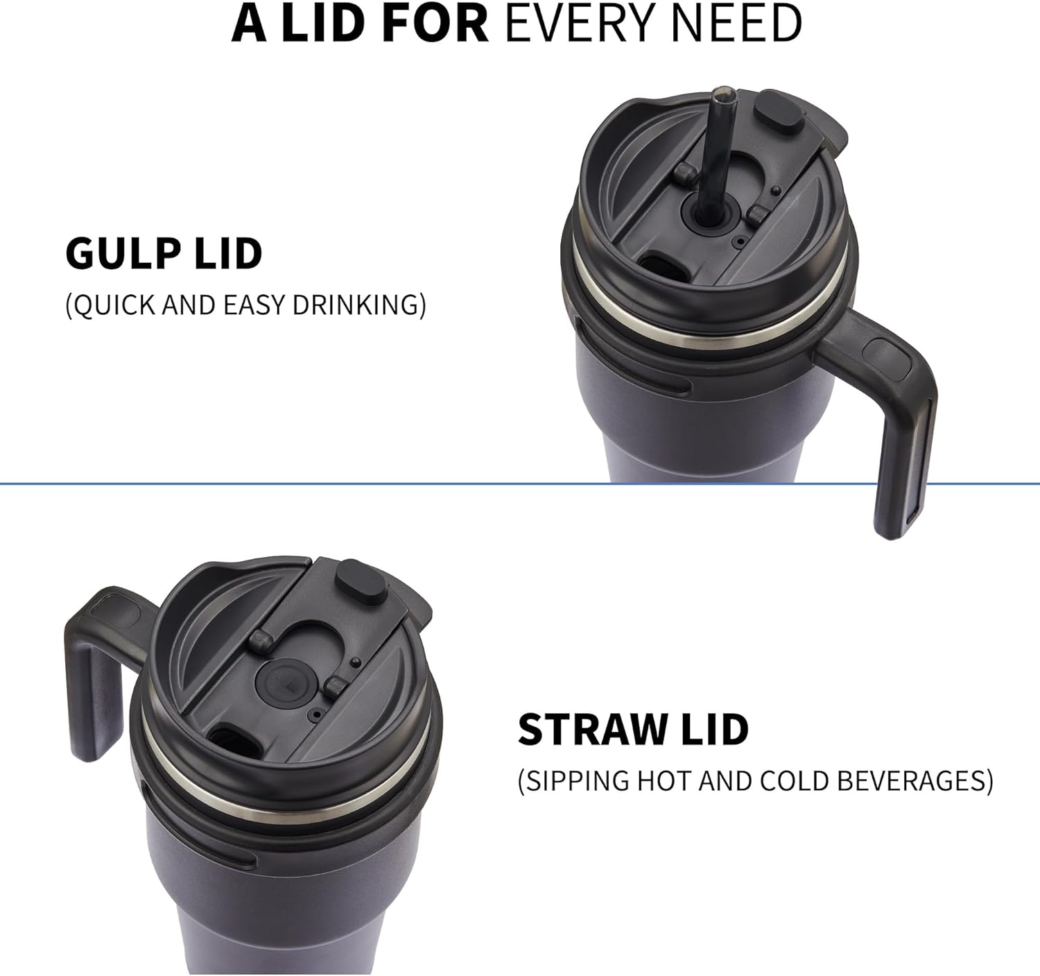 - 20 OZ COFFEE MUG TUMBLER: The water tumbler with handle is made from 18/8 food-grade stainless steel, it is durable, easy to wash, unbreakable, compact and portable. With a unique 2-in-1 sip and straw lid, a lid for every drinking need