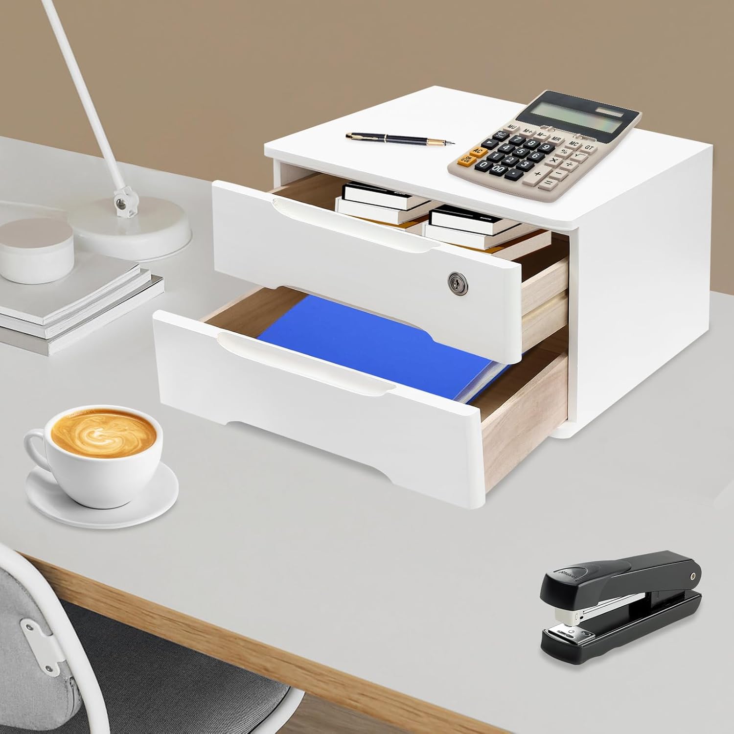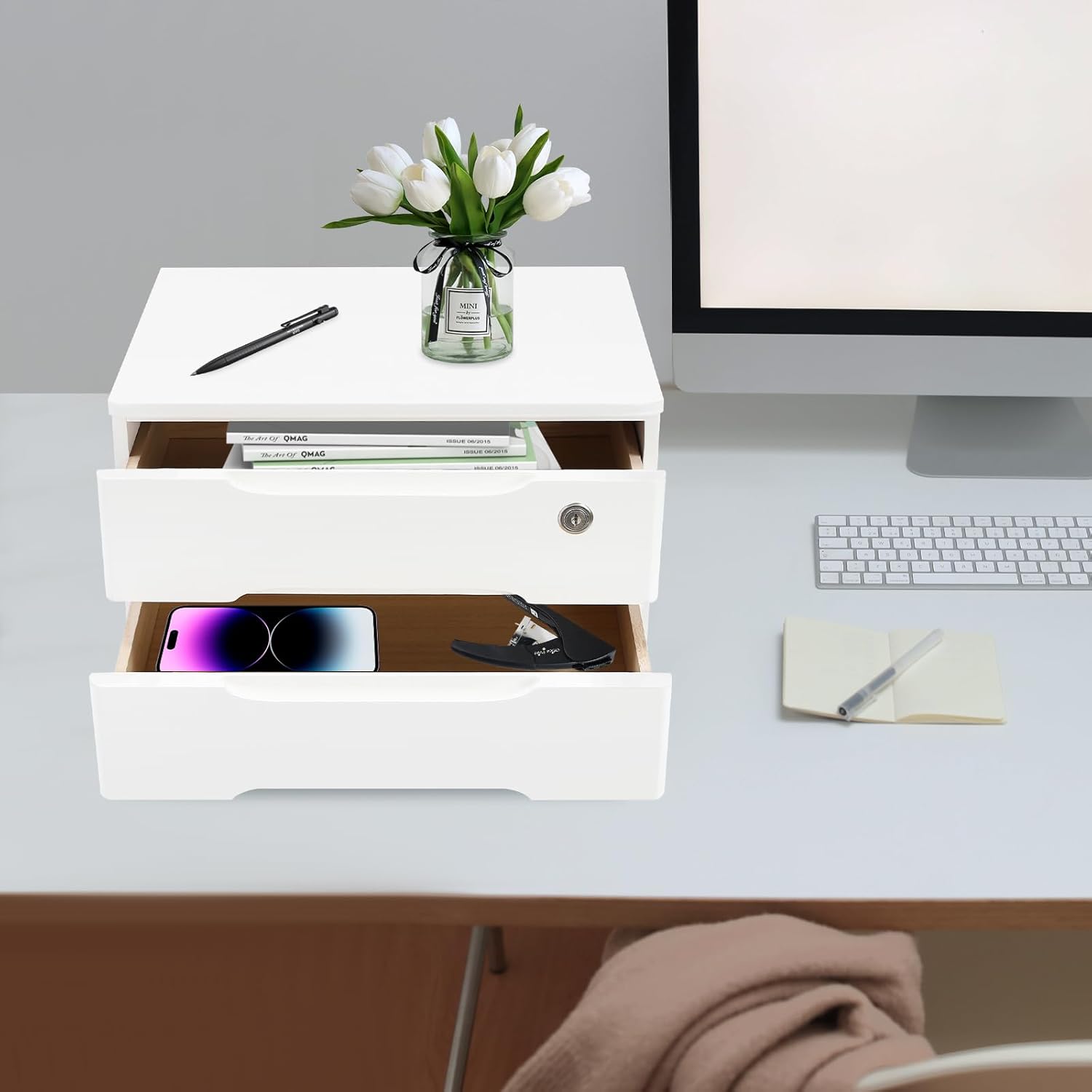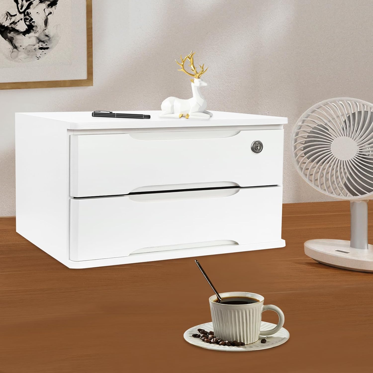 2-Tier Wooden Desktop Storage Box Desk Organizer with 2 Drawers and Lock Countertop Drawers Organizer for Office Supplies File Paper Cosmetic Jewelry, 15.4x11.8x8.5 in (White)