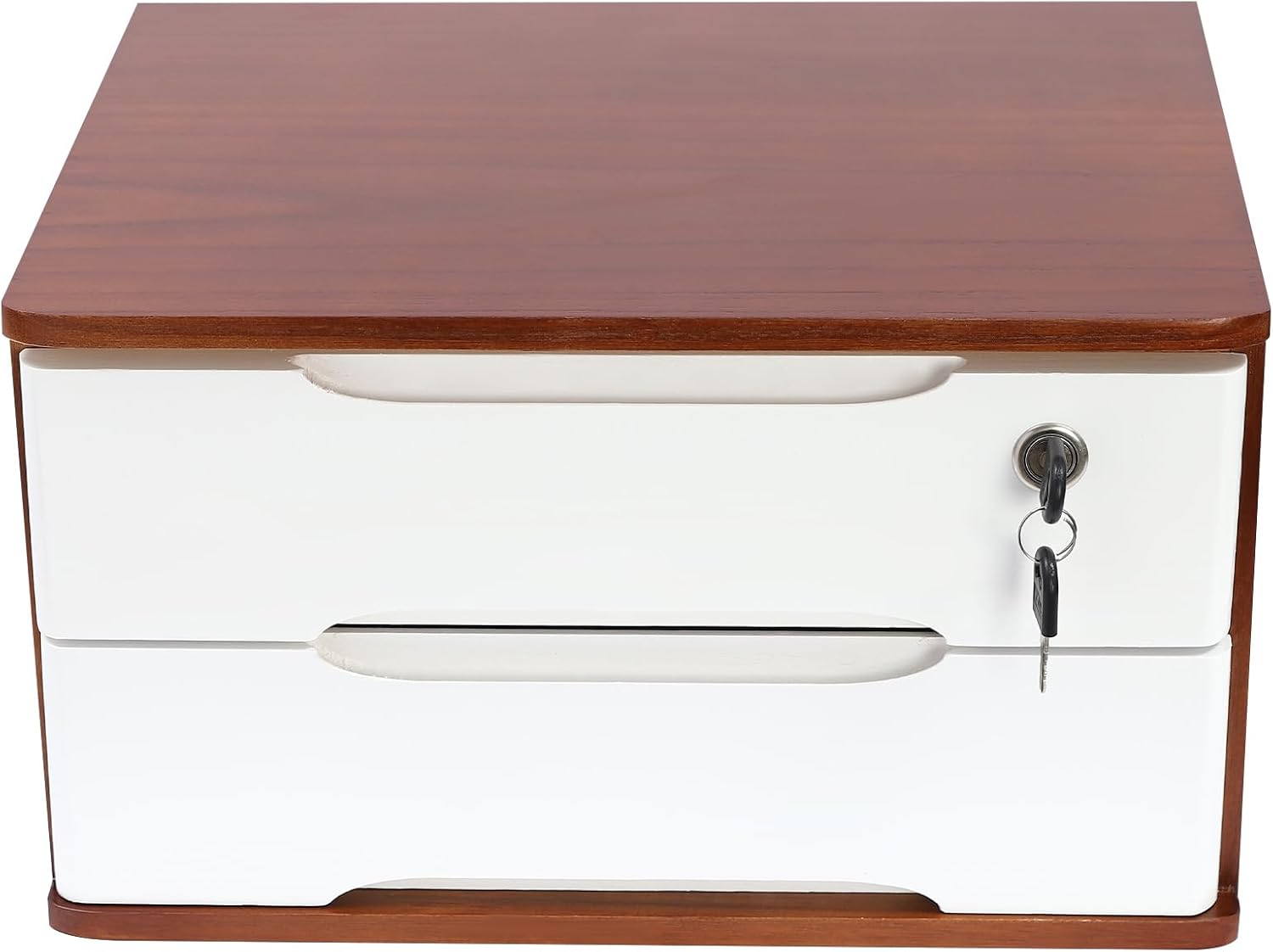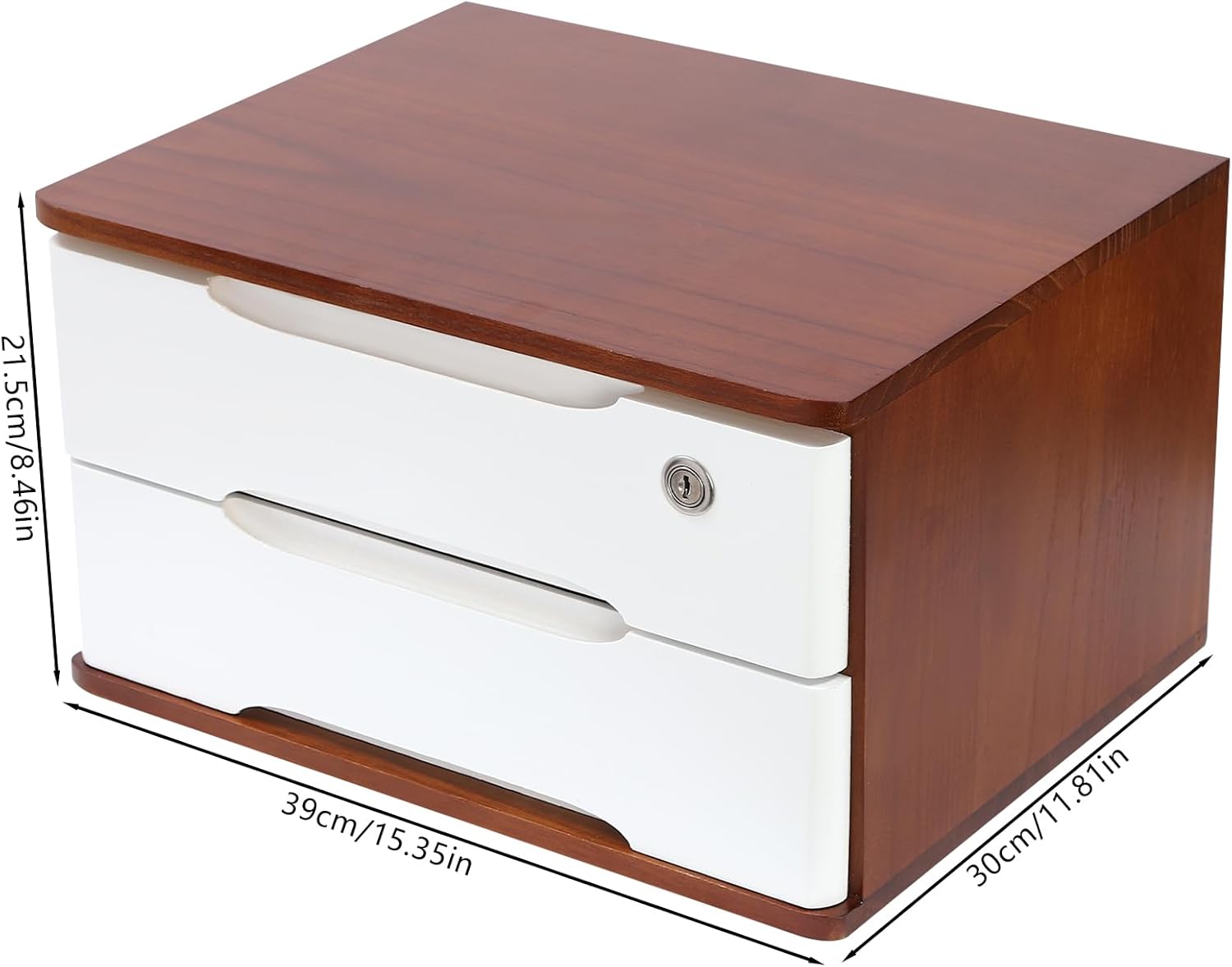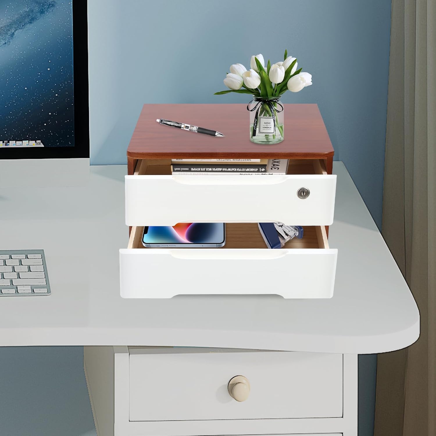 2-Tier Wooden Desktop Storage Box Desk Organizer with 2 Drawers and Lock Countertop Drawers Organizer for Office Supplies File Paper Cosmetic Jewelry, 15.4x11.8x8.5 in (Dark Brown and White)