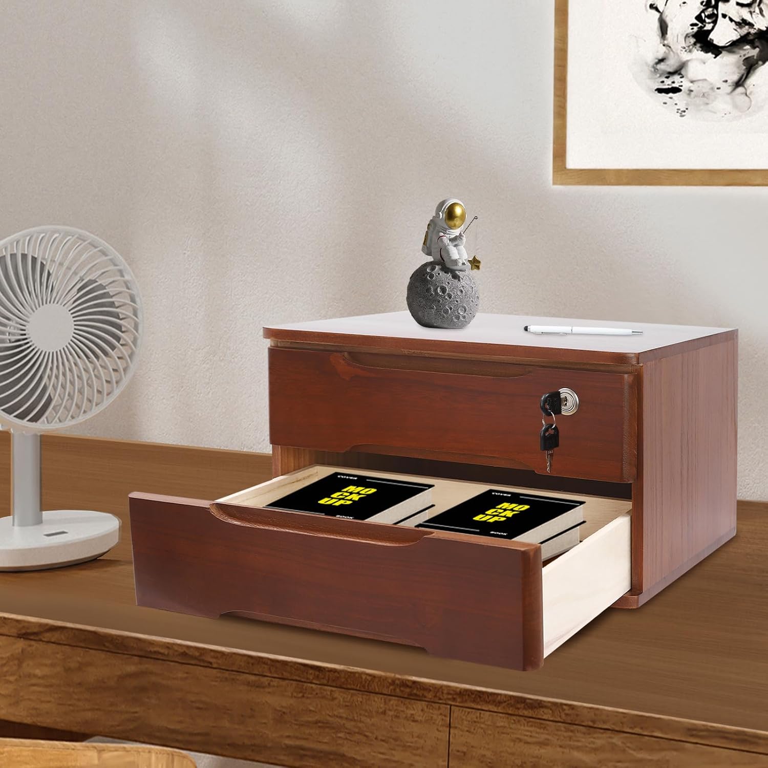 2-Tier Wooden Desktop Storage Box Desk Organizer with 2 Drawers and Lock Countertop Drawers Organizer for Office Supplies File Paper Cosmetic Jewelry, 15.4x11.8x8.5 in (Dark Brown)