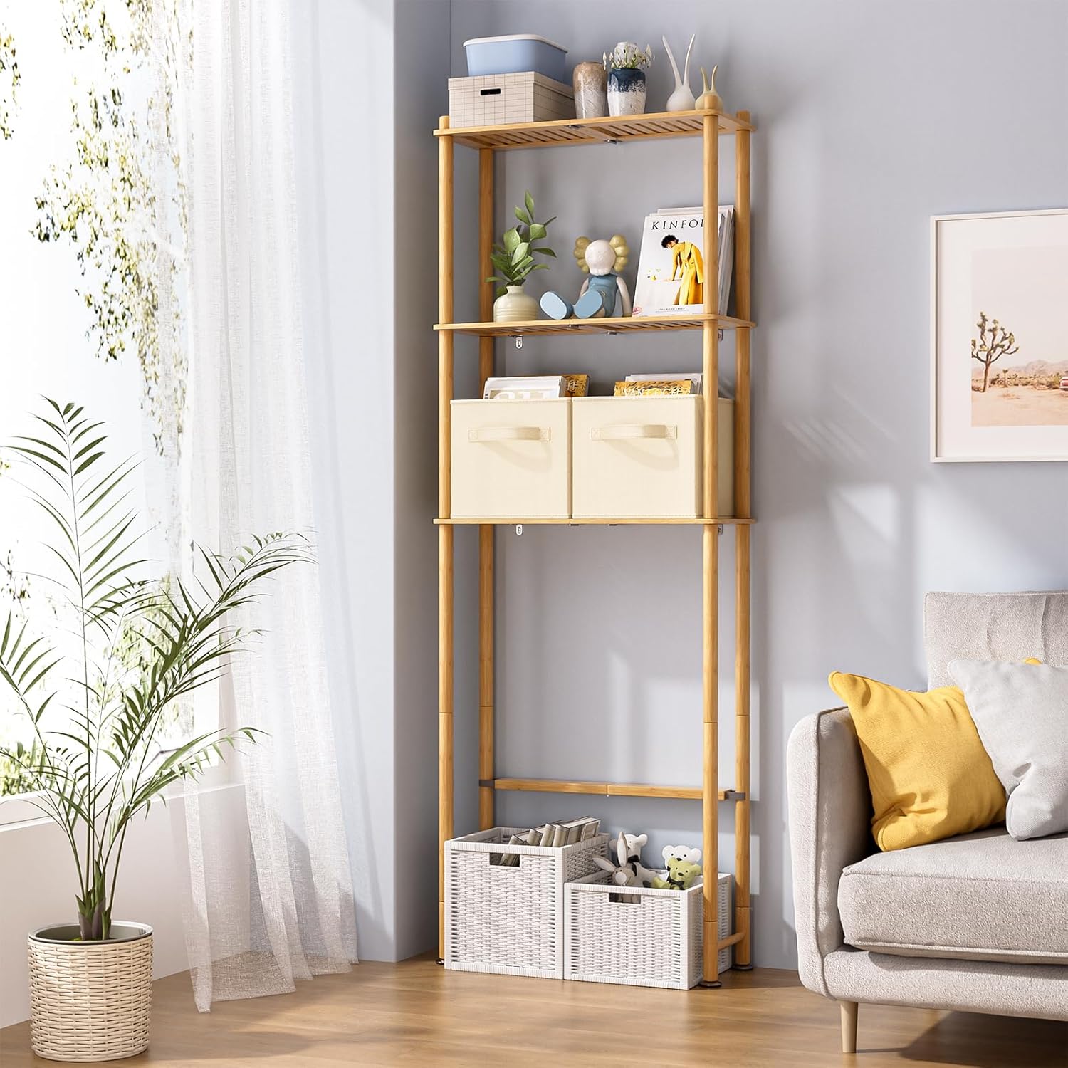 - Sturdy bamboo construction: Made of high-quality bamboo, this toilet shelf is solid, durable, and environmentally friendly. Paired with lightweight fabric bins, it adds a natural and stylish touch to your bathroom decor.