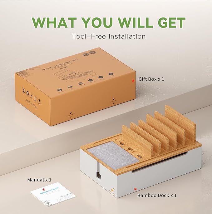 Pezin & Hulin Bamboo Charging Station, Electronic Devices Organizer for Multiple Devices Charger Such As Cell Phone, Tablet, Watch and More, Natural+White, (No USB Charger and Cables