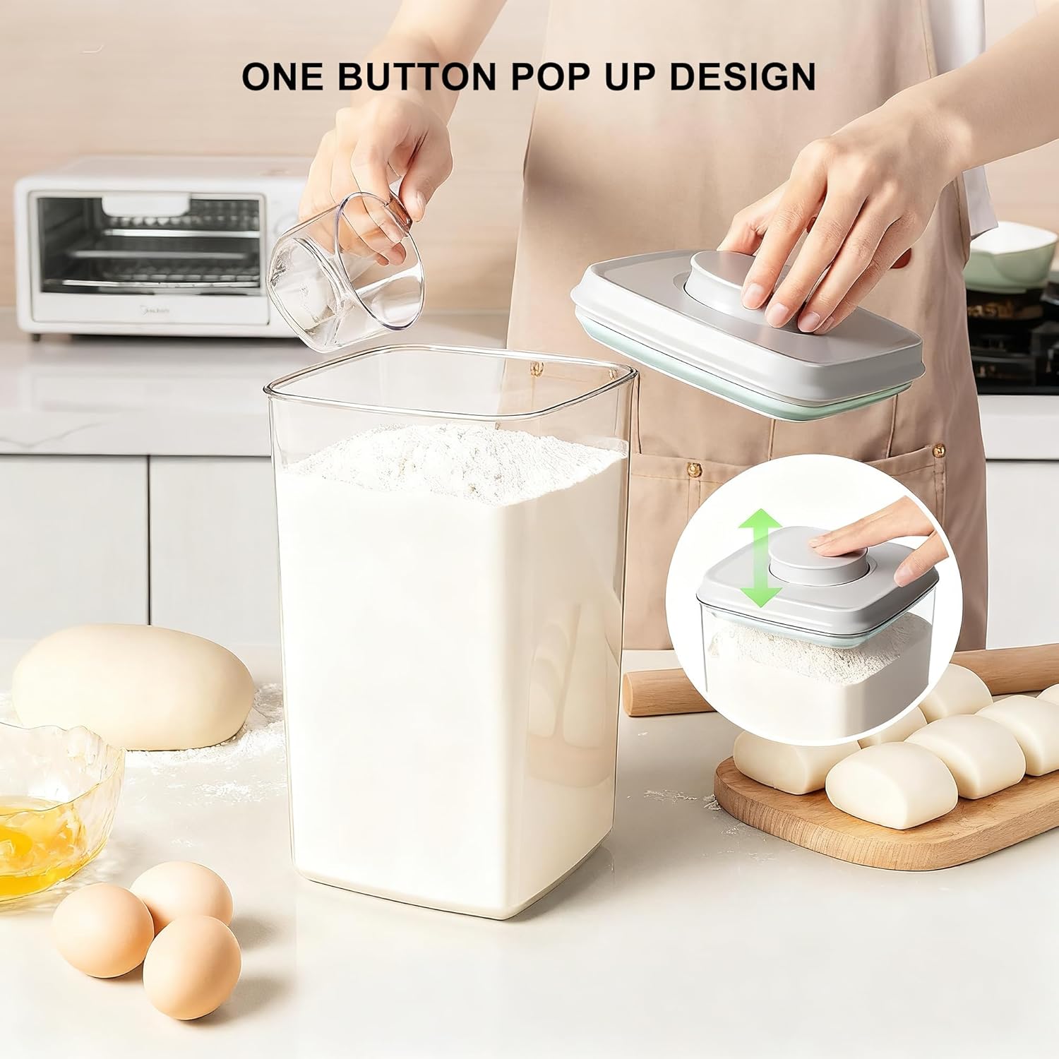 - 【130ml Measuring Scoop Included for Precision】Comes with a built-in 130ml scoop for accurate portioning—ideal as a flour container, rice storage container, or for meal prepping dry ingredients, pet food, or baking essentials.