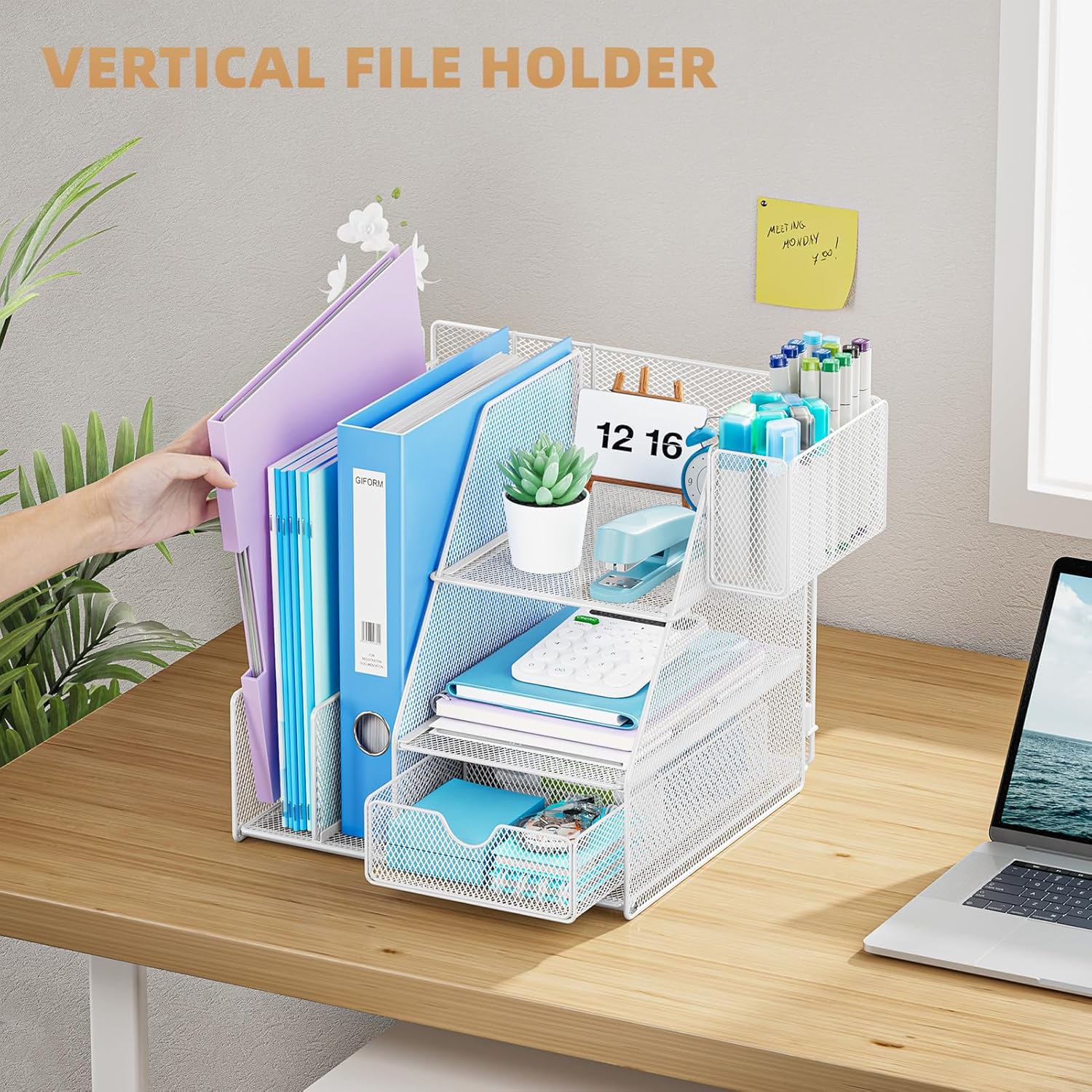 Marbrasse Desk Organizer and Accessories, 3-Tier File Organizer with Drawer and Pen Holder, Small Desktop Organizer and Storage for Workspace Office Supplies White