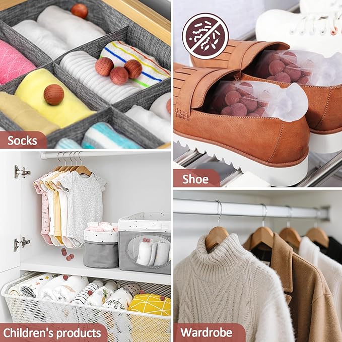 - Versatile Usage: Cedar balls can be placed on closet shelves, in drawers, in shoes, or used to line storage containers. They absorb moisture and odors, repel pests, and add practical value to any space that needs natural protection.