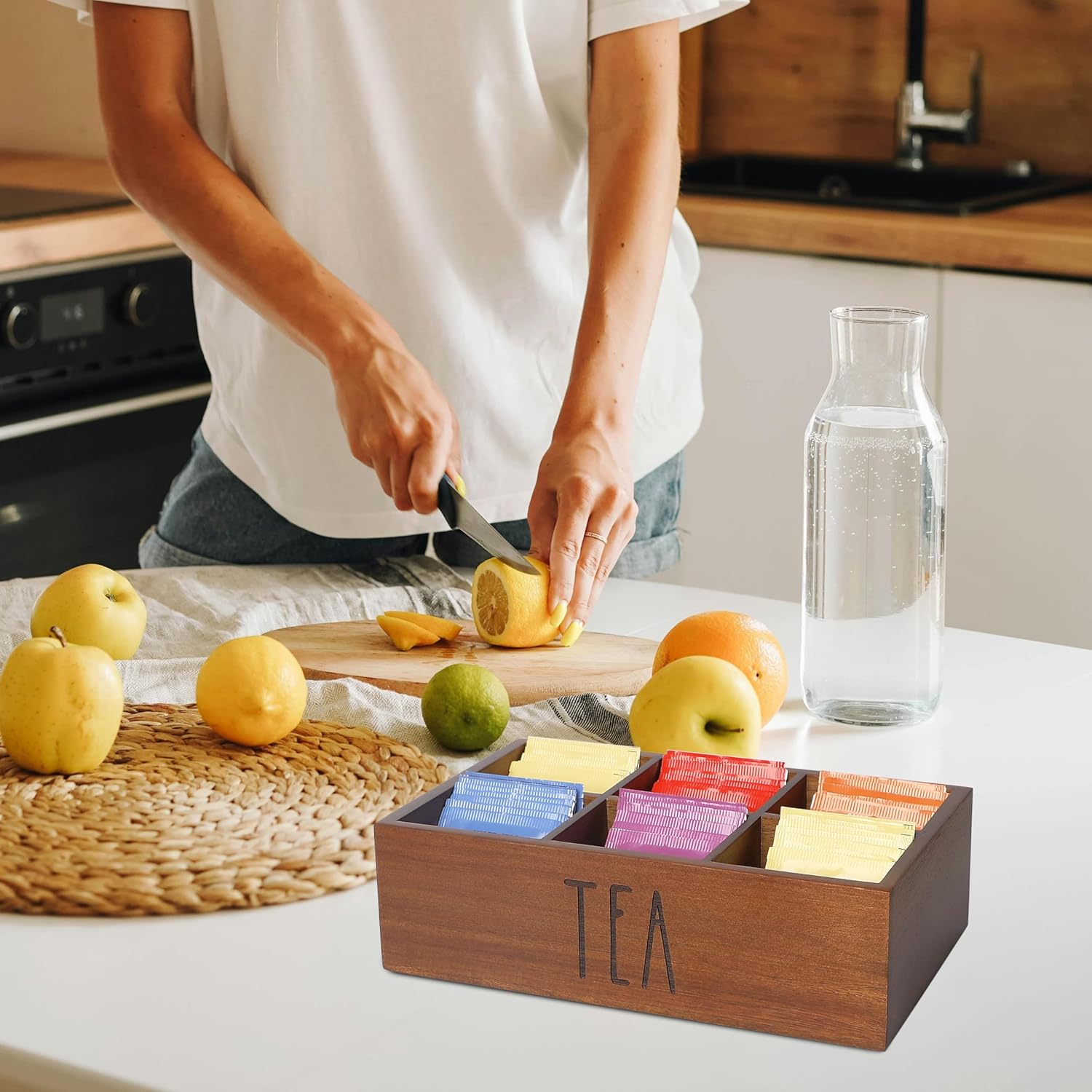 - VINTAGE FARMHOUSE STYLE: characterized by the word "Tea" , this organizer has a retro brown exterior that fits with most home decor, gives your tea station an elegant, warm and neat looking.This tea tea box organizer storage box is ideal for any home ,company or restaurant use.