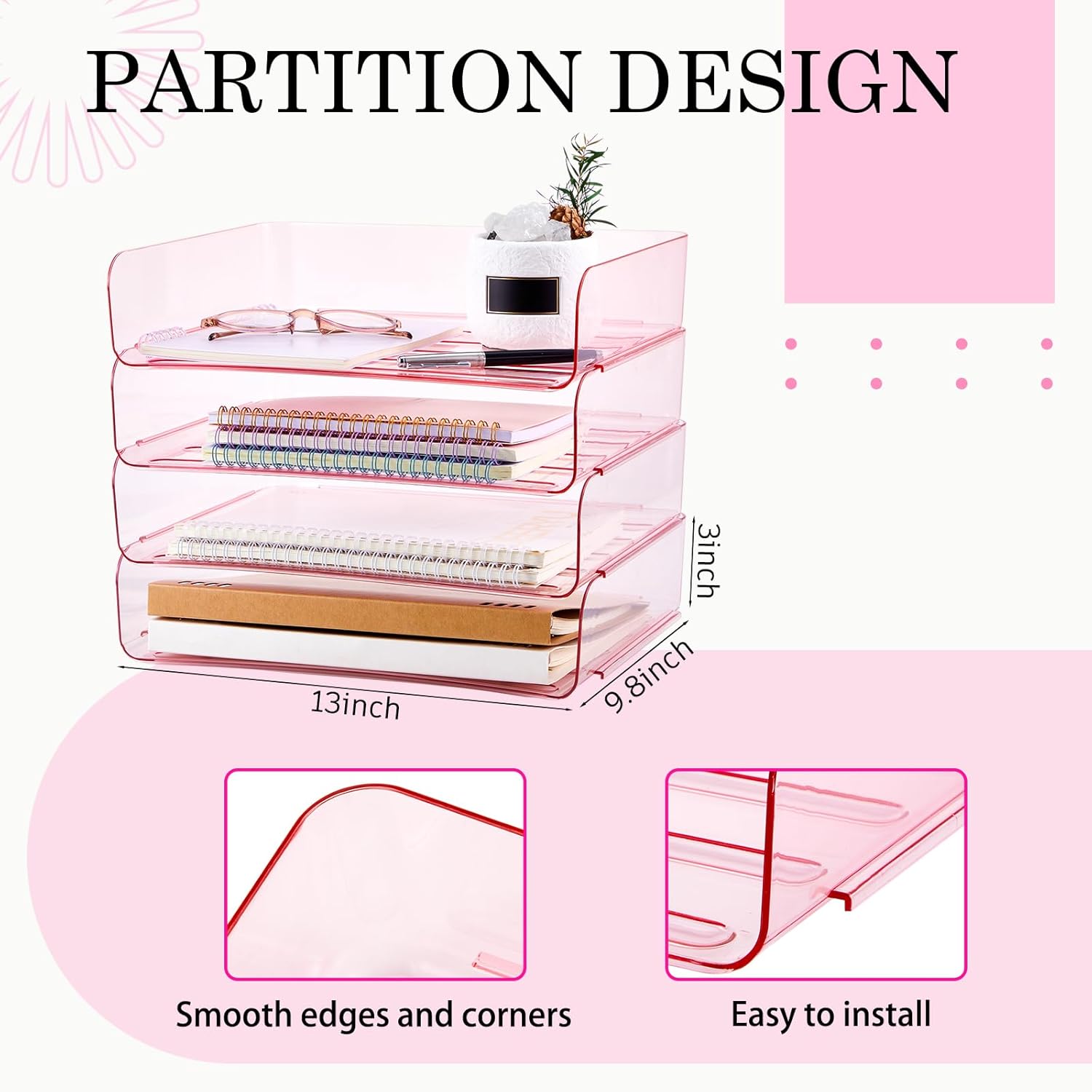 Harloon 4 Tier Acrylic Paper Tray 13 x 9.8 x 3 Inches Stackable Letter Clear Organizer No Need to Assemble Acrylic Paper Organizer File Tray for Office Workspace Desktop Storage (Transparent Pink)