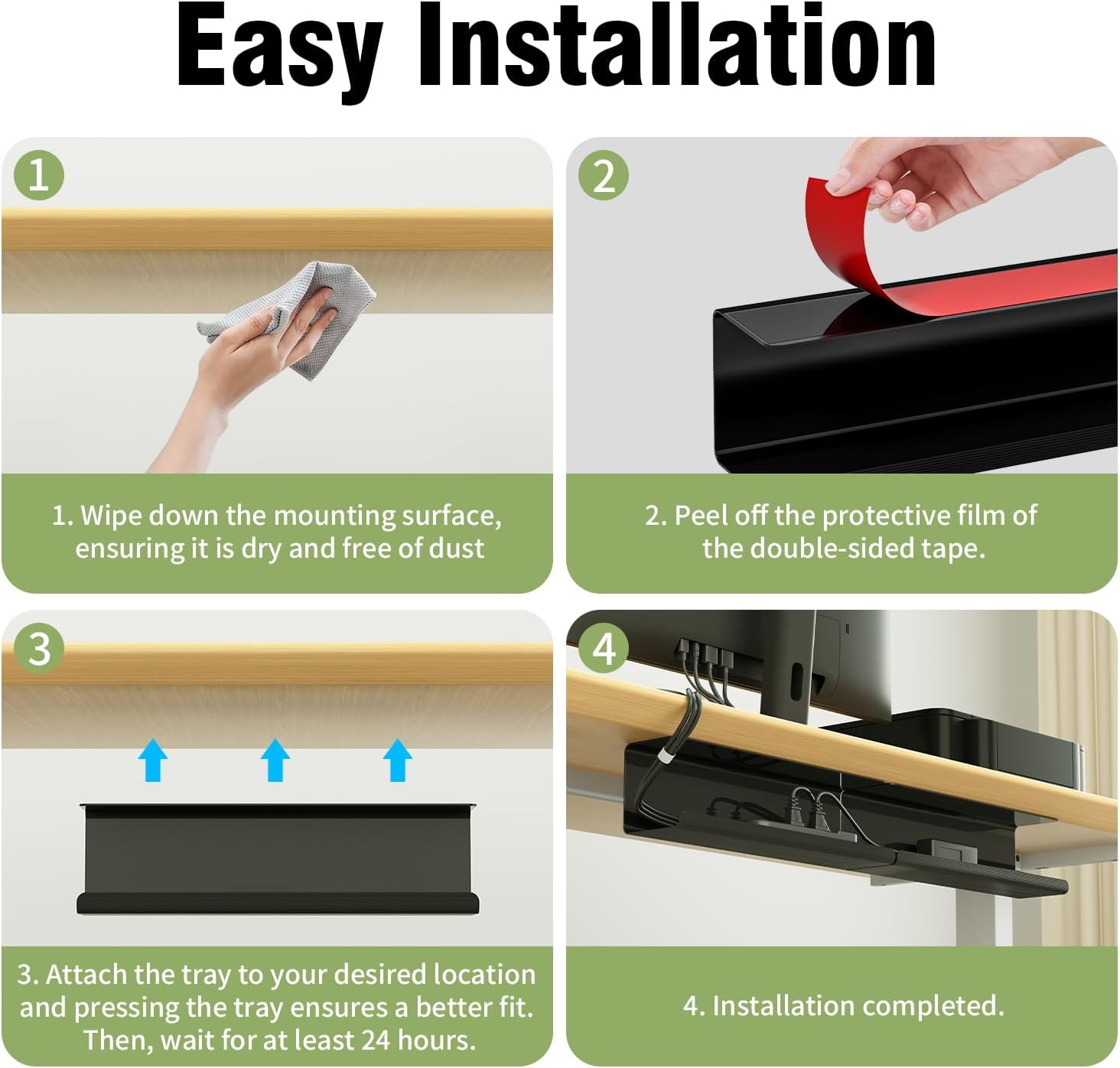 - Note: our Cable Management Tray adheres best to smooth surfaces only. For optimal hold, wait at least 24 hours after installation before loading with cables/power strips.