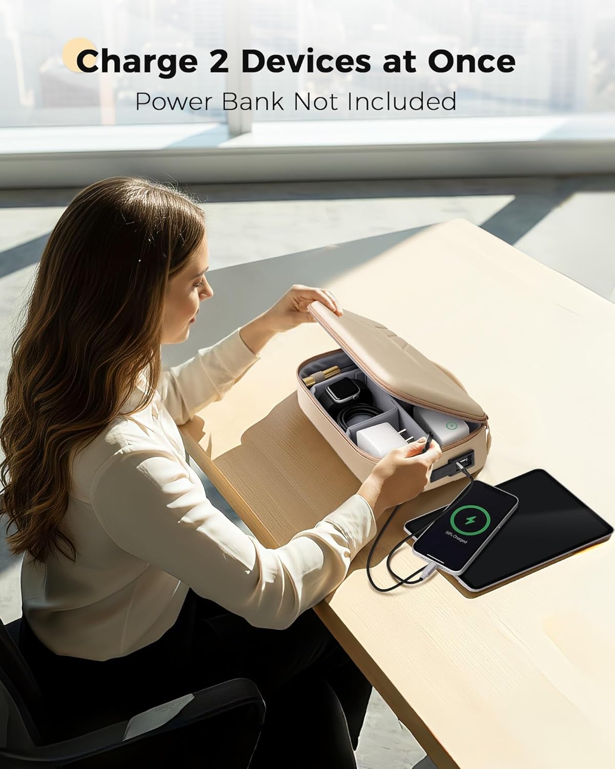 MATEIN Charger Cord Organizer with USB-C & USB-A Ports, Hardshell Cable Organizer Bag Cord Storage for Travel, Water Resistant 2-in-1 Electronics Case for Tech Accessories and Cosmetics, Apricot