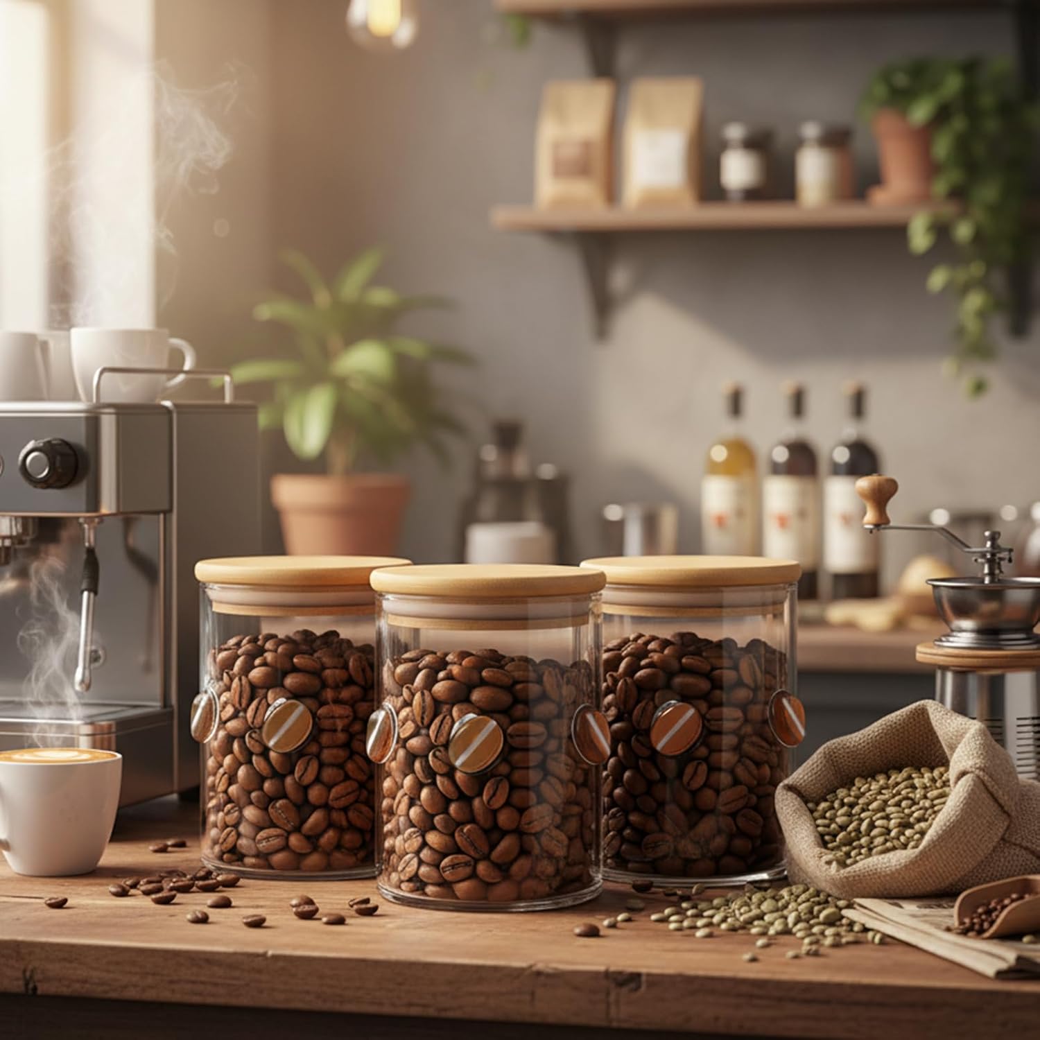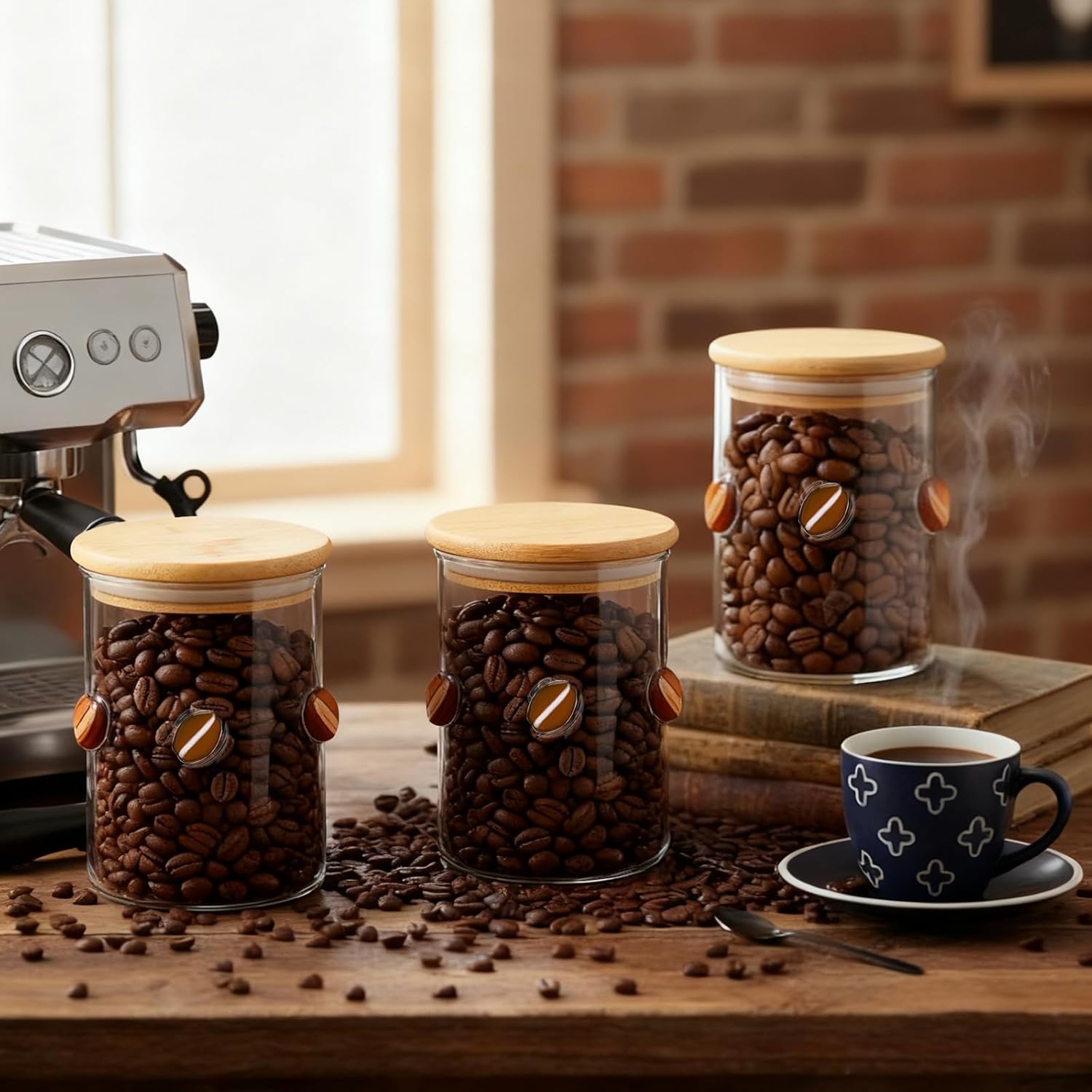 3 Pcs Coffee Glass Storage Jars with Airtight Bamboo Lid Coffee Bean Class Containers Storage Canisters for Serving Bath Salt, Sugar, Spice, Tea, Cereals, Condiment