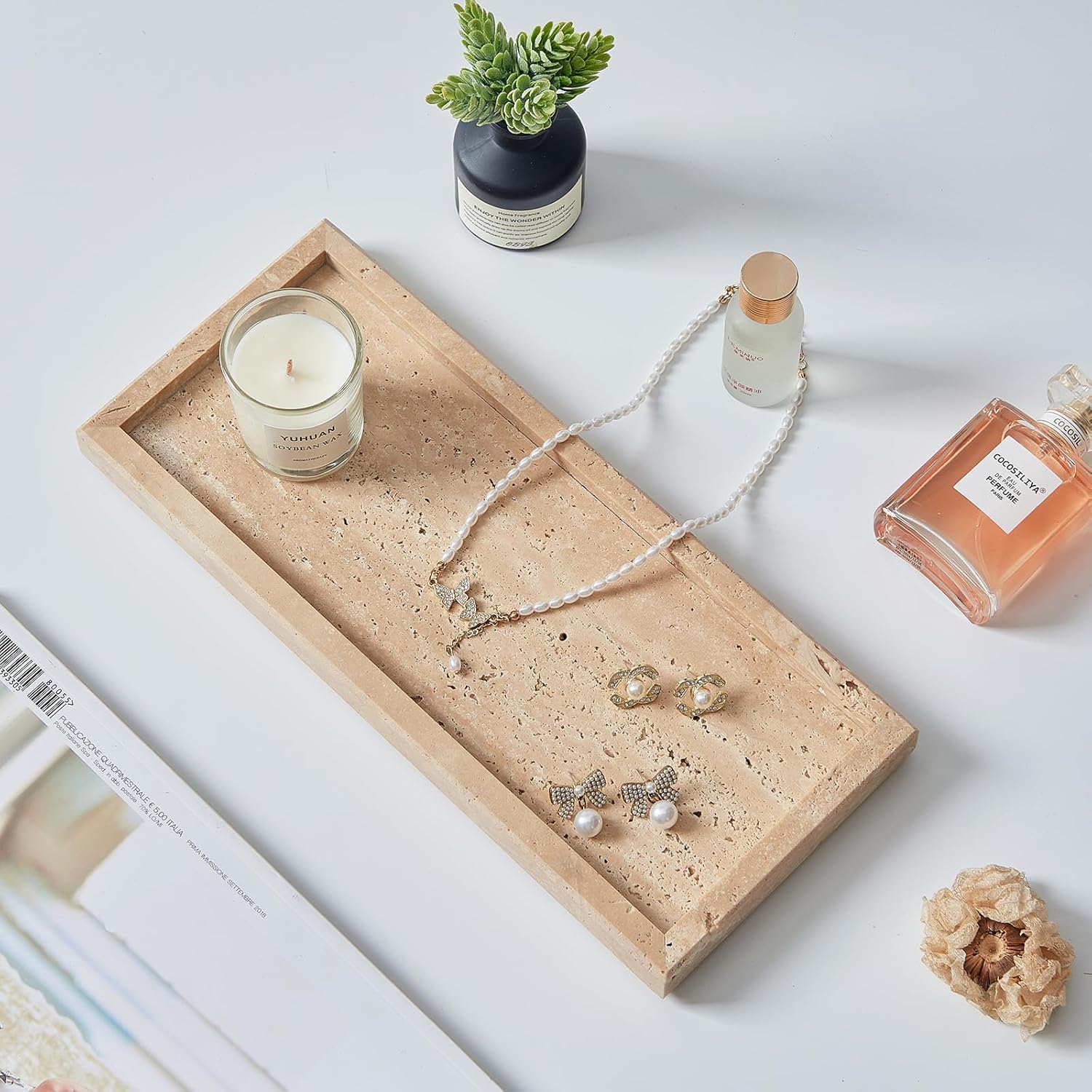 Natural Small Travertine Tray for Bathroom Vanity and Kitchen Sink, Stone Countertop Organizer for Soap Dispenser, Jewelry, Perfume, Candle, Ring, Home Decor, Non-Resin Non-Ceramic