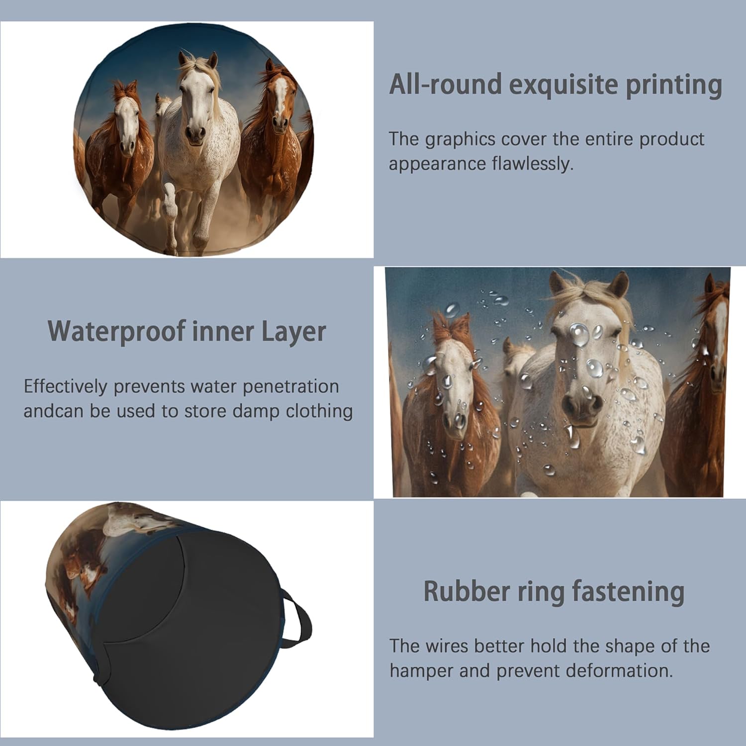 - Unique Design:This Running Horse laundry basket adopts a foldable design.When not in use,it can be folded and stored to save space.There are handles on both sides for easy grip,making it easy to pick up and move.