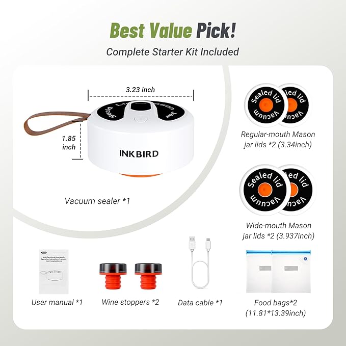 - 【Save Money with Reusable Silicone Lids!】-Patented Design!No need for disposable mason jar lids or converter kit! INKBIRD 2025 latest mason jar vacuum sealer kit comes with food-grade silicone lids that are infinitely reusable, no repeat purchases and waste.Extra-thick silicone mason jar lids for jar vacuum sealer create an airtight seal on your jars/canning—keep food fresh up to 8X longer, no leaks when pouring! Perfect for dry, liquids, and everything in between – your pantry's new money-saving superhero